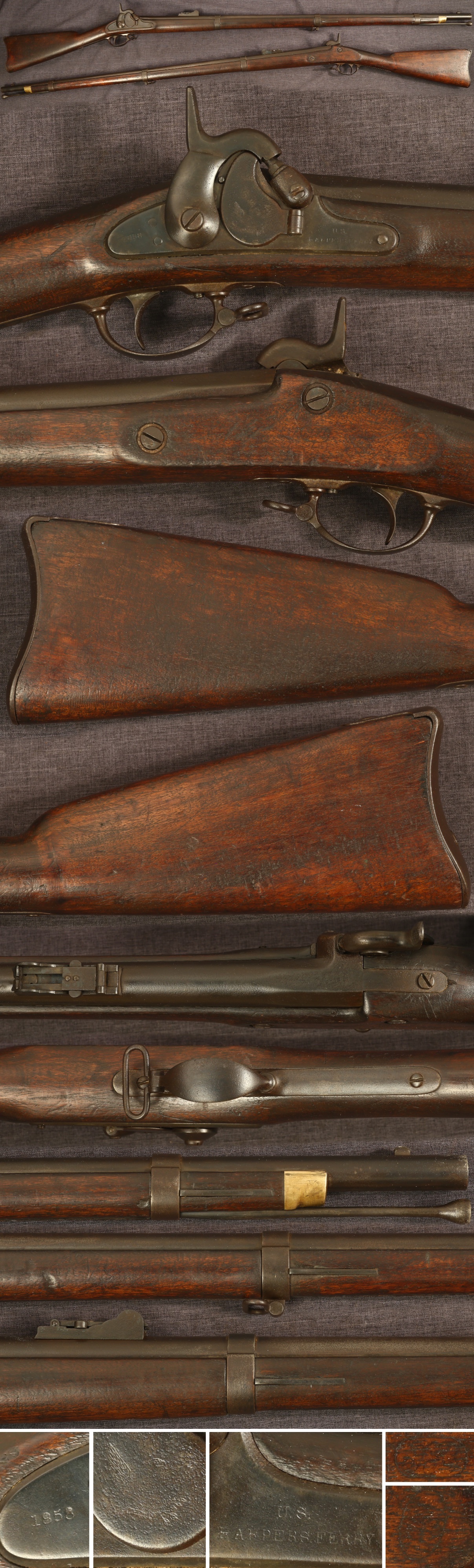 Harpers Ferry M1855 Maynard primed rifled musket. Dated 1858 on lock, eagle on door and barrel proofs are worn from use, two cartouche outlines in stock are visible. Nice complete gun with both sling swivels. Metal parts have even brown granular surfaces overall with some pitting in the barrel breech. Stock shows moderate wear and use, may have been lightly cleaned at some point, shows expected handling marks, a couple minor dings, and a small chip at rear of barrel tang. Overall honest condition for a gun that probably saw the entire Civil War, possibly on the Southern side. Mechanically good including automatic Maynard primer, sold as a collector item only, not warranted safe to shoot.