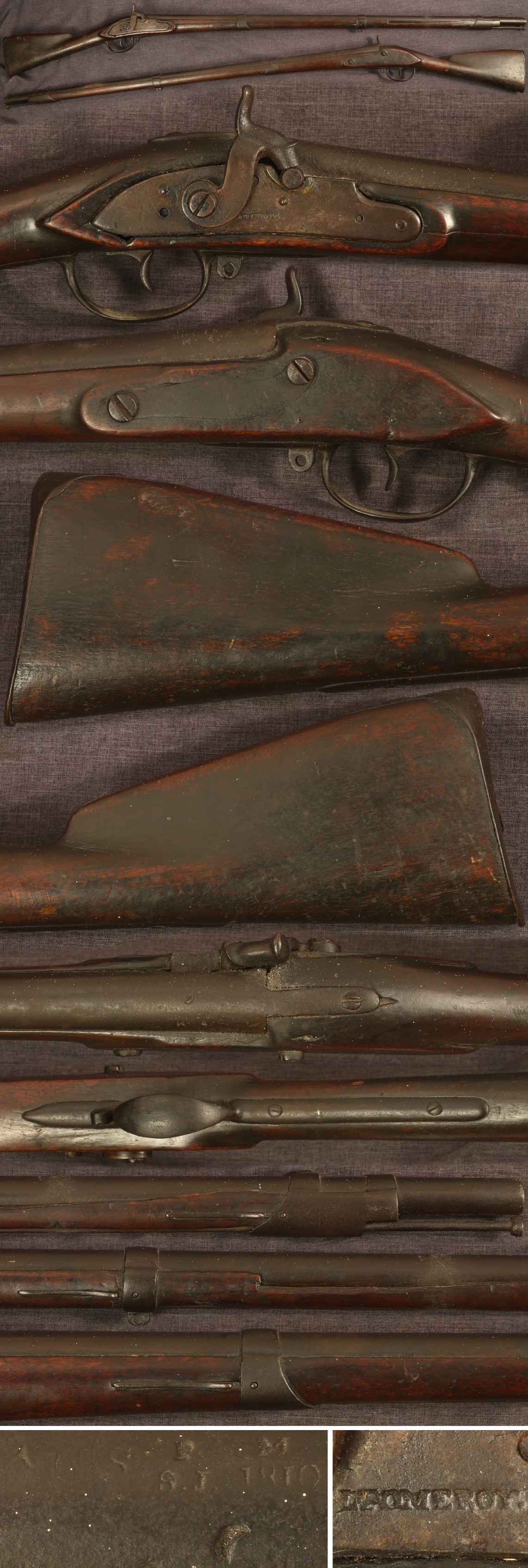 M1808 L.Pomeroy, as marked on lock, New York State contract musket, converted to percussion. Flayderman 9A-164. Inspection marks, 1810 date, and "SNY" property marking on barrel breech. Round stock cartouche is evident opposite the lock, but is concealed under a thick patina. Metal parts are untouched and uncleaned with some expected pitting in the nipple area. Sling swivels are absent. Nice matching blacksmith-made ramrod. Stock has an equal age patina and uncleaned appearance, some worn slivering to the ramrod channel, a long sliver missing from forearm edge on right side, some other minor worn chipping to the forearm edges, and various marks from handling and use. Trigger seems to release the hammer from half cock, full cock operates as expected. Sold as a collector item only, not warranted safe to shoot.