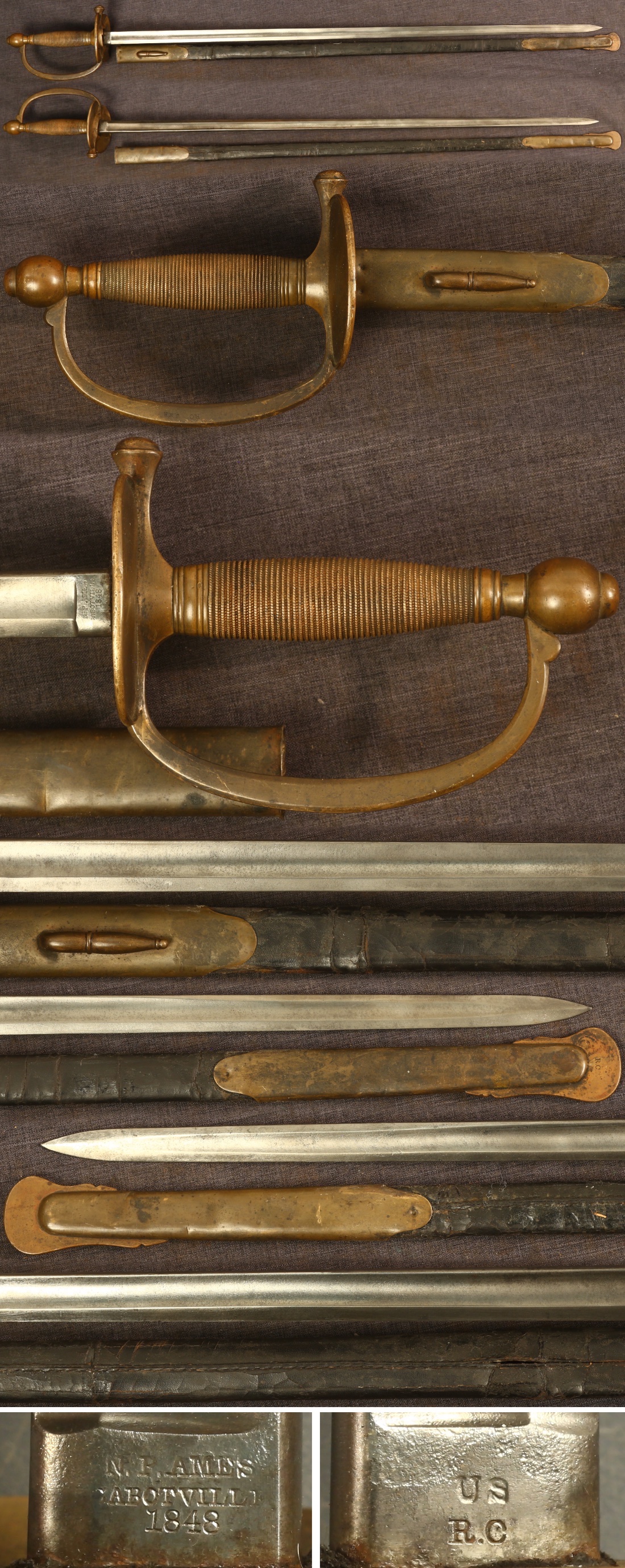 | C1830 Ames knighthead sword with engraved brass scabbard, interesting Mexican motifs on blade of eagle with snake and Phrygian cap with rays | Excellent | $1950.00 |