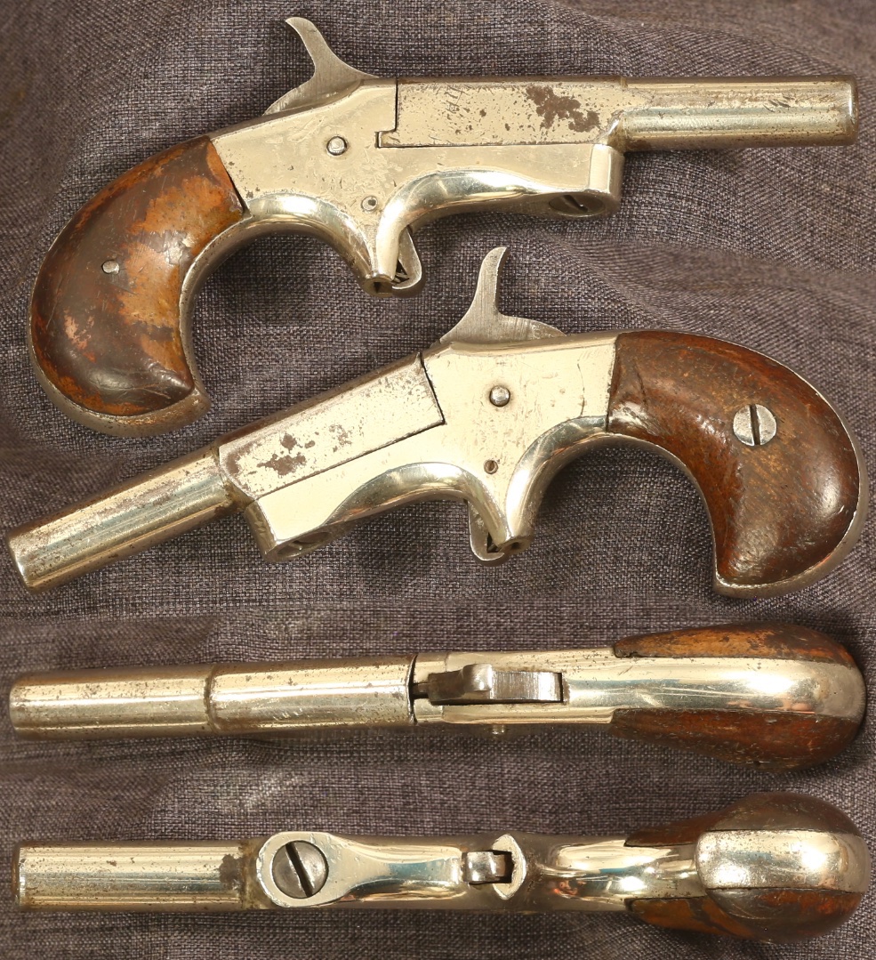 Small unmarked "Eclipse" style .22 caliber side-opening single shot derringer. Serial number 64. 2-1/2" barrel. Metal parts have bright original nickel finish showing some flaked spots and marks from handling. Wood grips are good, showing wear and marks from handling. Hammer has strong spring tension but does not cock. Sold as a collector item only, not warranted safe to shoot.