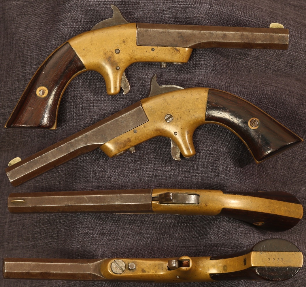 SOLD - unmarked Merwin & Bray style .32 rimfire single shot derringer. Serial number 2230. 3-1/2" octagon barrel. Metal parts have a pleasing medium patina overall. Wood grips show light wear and use with a small corner nick on front corners. Hammer will cock only if trigger is held forward. Sold as a collector item only, not warranted safe to shoot.