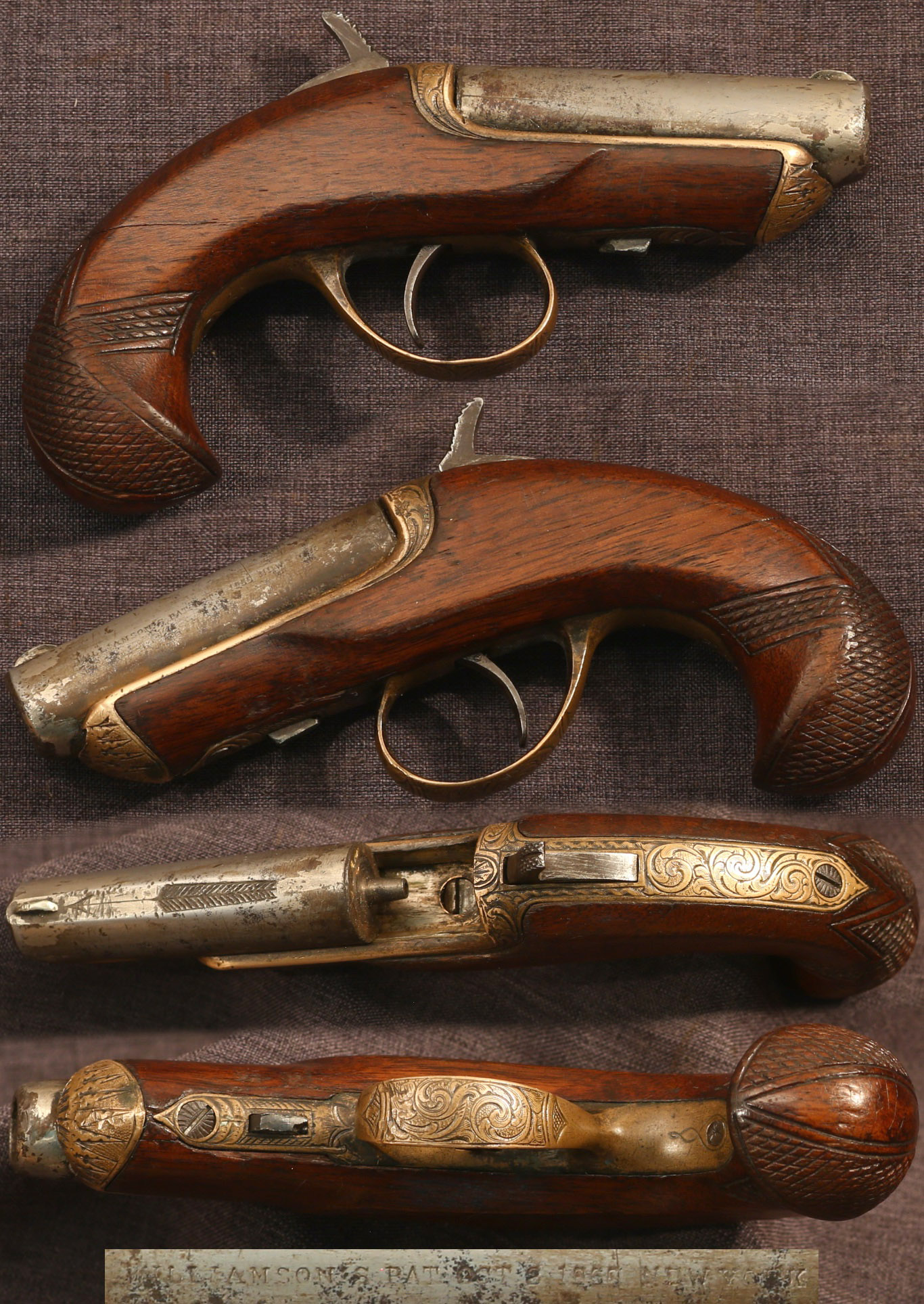 SOLD - Williamson patent .41 rimfire or percussion single shot derringer. 2-1/2" barrel, about 5-1/2" overall. Standard patent marking on left side of barrel and engraving on metal parts. Barrel is mostly a light to medium gray patina with some traces of nickel finish. Brass has a pleasing light to medium patina. Stock shows light wear and use, for whatever reason, perhaps the practice of carrying in a pocket, these stocks are often badly battered and commonly broken in the wrist. This stock shows nice original edges and checkering, a light hairline in the wrist, and a couple minor cracks/slivers next to the triggerguard by the barrel release. Contains the percussion adapter cup that is thought to be a reproduction. Hammer has weak spring tension and doesn't always stay cocked. Sold as a collector item only, not warranted safe to shoot.