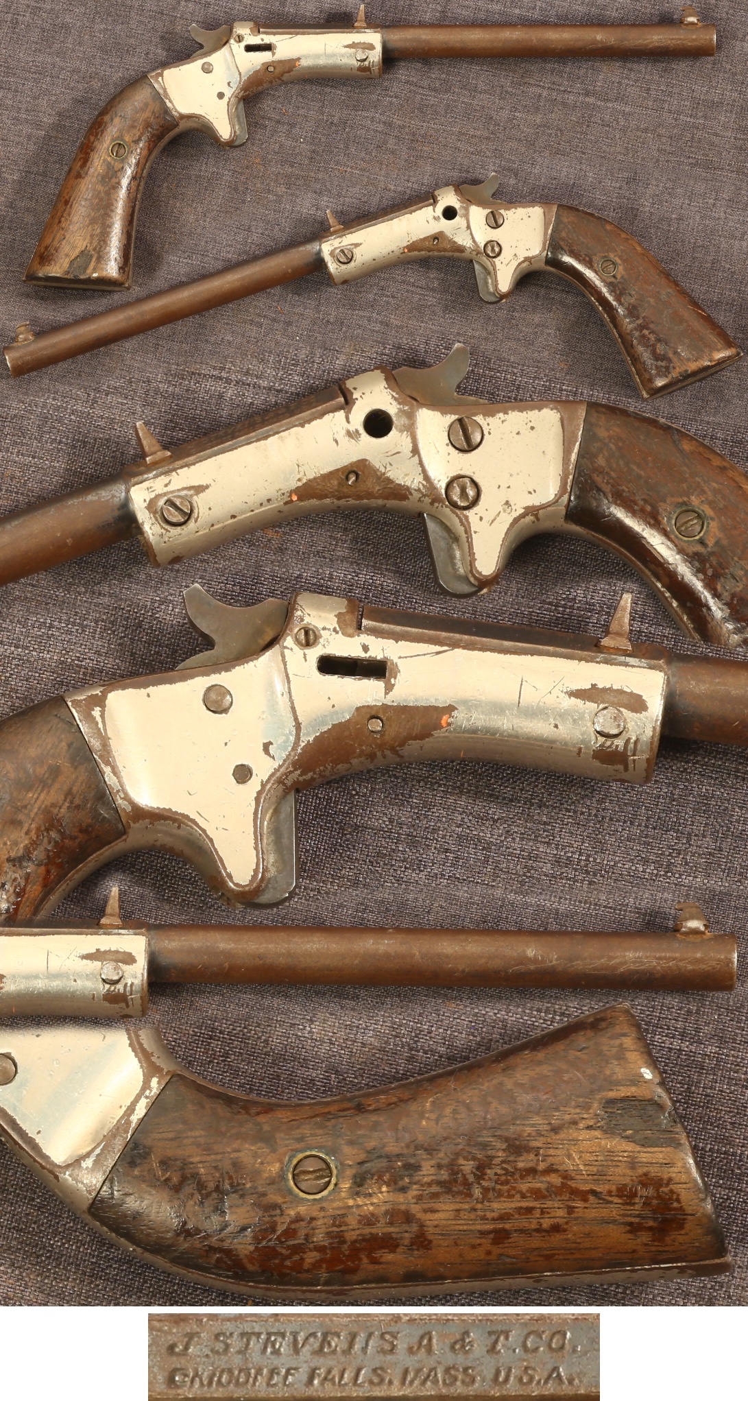 SOLD - J.Stevens "Old Model Pocket Rifle" 6" barrel tip-up single shot pistol. Serial number 94915. Marked on left flat of barrel breech "J.STEVENS A & T CO/CHICOPEE FALLS,MASS USA." Barrel has open sights, plumb patina. Frame has original nickel finish that is worn off on high edges and wear points. Grips have battered original varnish and a well-worn chip on the right side. Hammer spur was broken off long ago, barrel latch and extractor are absent. Cylinder pin is present, and the hammer still cocks and holds. Sold as a collector item only, not warranted safe to shoot.
