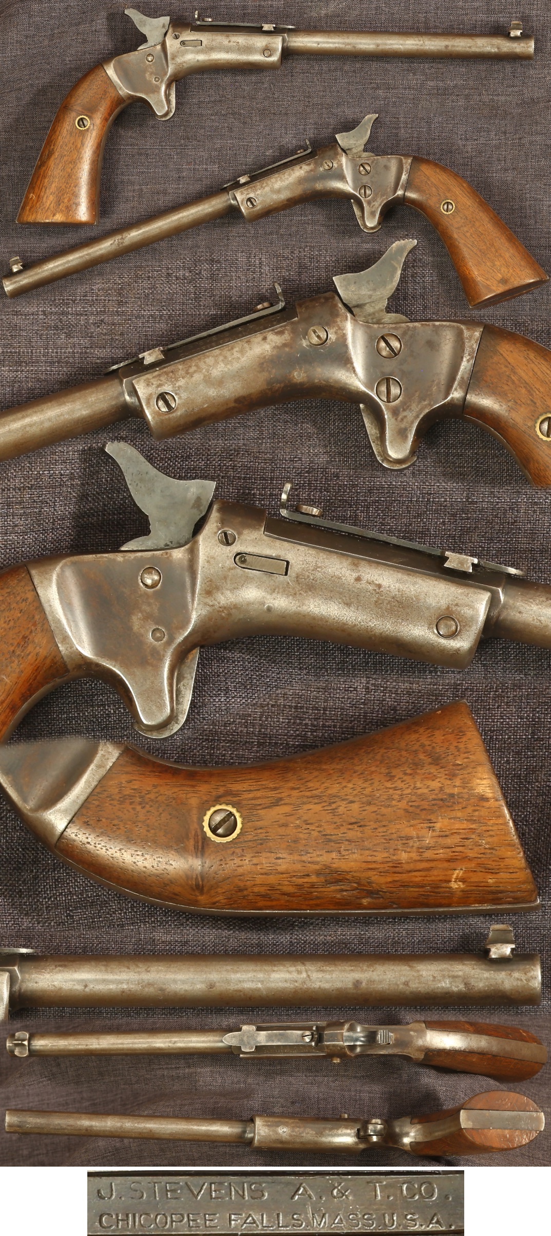 J. Stevens "tip up" single shot .22 caliber target pistol. Serial number 47820. 6" part octagon, part round barrel with elevation adjustable rear sight and fixed front sight. Metal parts have a mottled gray patina overall. Wood grips are good, showing light wear from use with some minor handling marks, and a couple minuscule corner nicks. Butt shows some dings from improper use as a hammer. Mechanically good, sold as a collector item only, not warranted safe to shoot.