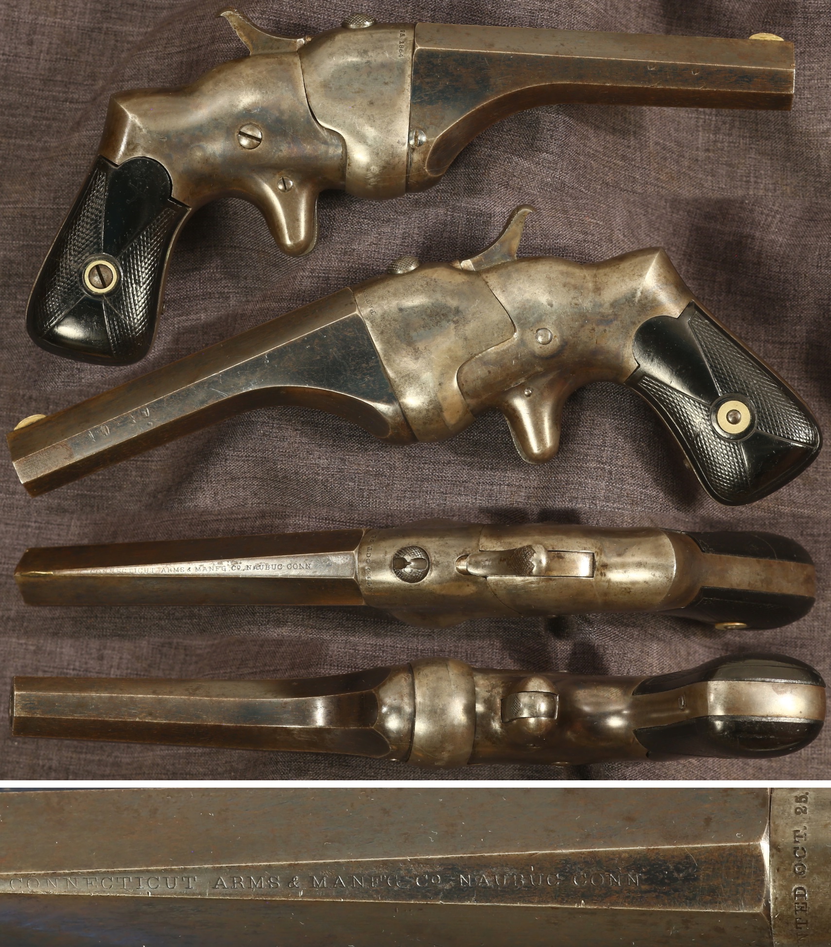Hammond's patent "Bulldog" single shot .44 rimfire caliber single shot derringer by the Connecticut Arms & Manufacturing Company of Naubuc, Connecticut. Serial number 1567. Standard markings on barrel and breech block. Novel action that swings open to the side for loading. Standard 4" barrel. Metal parts have very fine original blue finish on the barrel and case colors on breech block/frame. Checkered hard rubber grips are good, showing expected wear and use, with a very faint crack on the right panel. Mechanically good, sold as a collector item only, not warranted safe to shoot.