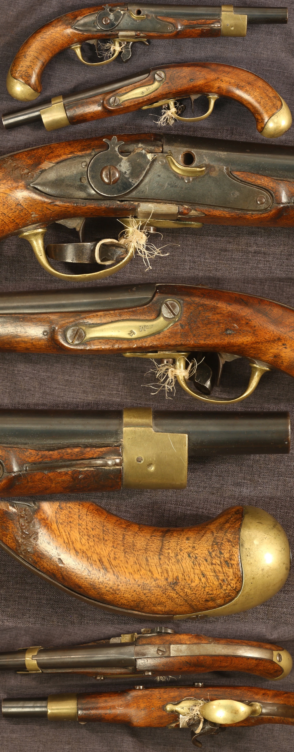 French Year IX (1800) style percussion conversion military pistol. Charleville marked lock and proofs on various metal parts. 8" round barrel with octagon breech section, .69 caliber bore. Brass parts are a light yellow with added finish on barrel and lock. Different style barrel band than usually observed. Hammer is broken and percussion drum is missing from barrel. Stock shows average wear and use overall, missing a sliver of wood between lock and barrel band, and a crack at rear of lock. Sold as a collector item only, not warranted safe to shoot.