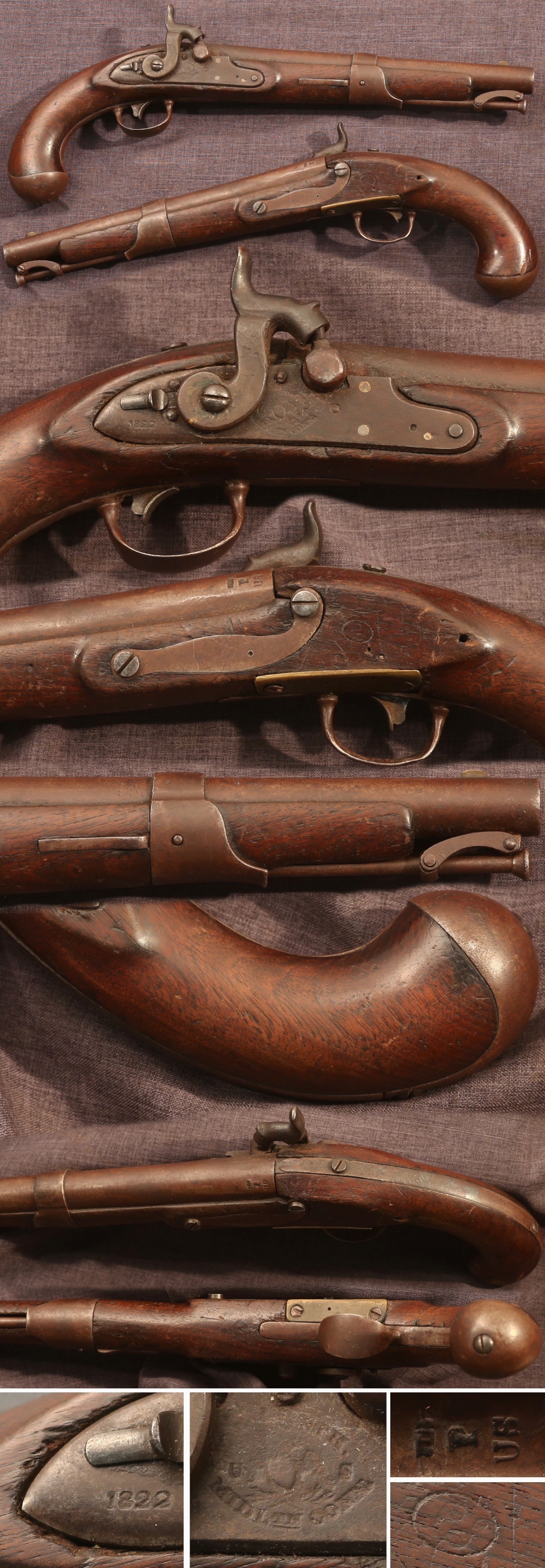 US M1819 percussion conversion Simeon North contract pistol. Dated 1822 at back of lock and nice eagle marking in front of hammer. Bolt barrel proofs and good stock cartouche opposite lock. Metal parts have an attractive patina overall with some pitting in the barrel breech area. Stock shows average wear and use with expected handling marks, scattered minor edge chips, and a break in the triggerguard area that was secured well with a brass plate and two screws, which doesn't show any play. Has a crack and chip by the head of the rear lock bolt. Mechanically good, sold as a collector item only, not warranted safe to shoot.