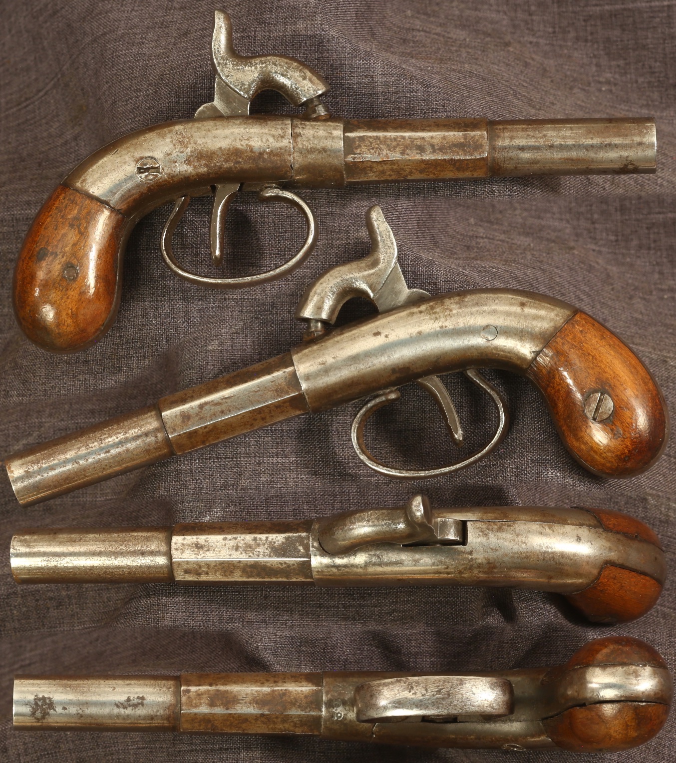 Small unmarked center hammer percussion single shot pocket pistol. Serial number 402 on underside of barrel. 3" part octagon, part round barrel of about .31 caliber. Metal parts are partially cleaned with some minor pitting. Wood grips show light wear and use with some minor handling marks. Mechanically good, sold as a collector item only, not warranted safe to shoot.