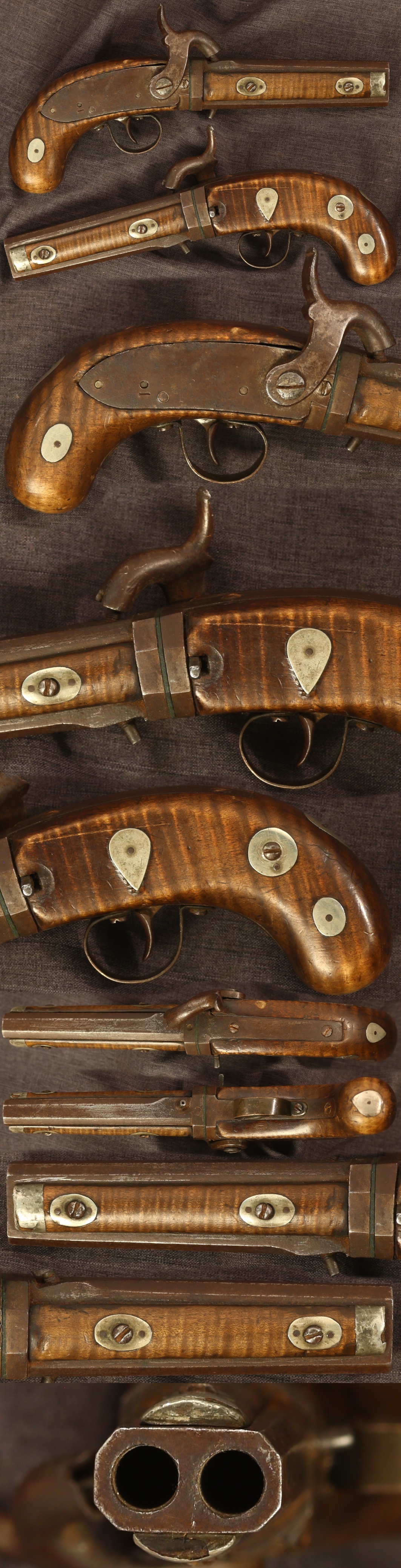 Wonderful swiveling breech Kentucky pistol. This is the only swiveling breech Kentucky pistol we have ever seen. 4-5/8" barrels made in one piece, with bores of .36 caliber. Curly maple grip with curly maple side panels on barrels. Metal parts have a medium patina overall with some pitting in the nipple areas and some light cleaning having been done to the barrels, probably looking for markings, which were not present. Unique gunsmith made lock. Interesting early nipples. Beautifully made stocks show average wear and use with a few minor age checks and handling marks. Gun is gracefully made showing unique handwork with 10 total silver inlays and escutcheons, some of which are endearingly imperfectly shaped. Uniquely shaped hammer. Brass triggerguard with rich patina. Pewter forearm tips are worn through a little on the extreme tips from many years of careful carry. This is a truly special gun lovingly handmade and owned through the years certain to be a key display piece for a serious collector. Functions mechanically, but spring tension is a little weak. Sold as a collector item only, not warranted safe to shoot.