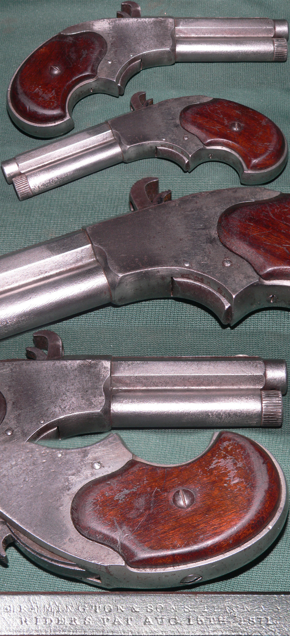 Remington Rider magazine pistol. Metal parts are mostly a medium gray color with light granular pitting. Wood grips are very good, showing wear on the edges and minor scattered marks. Mechanically good, sold as a collector item only, not warranted safe to shoot.