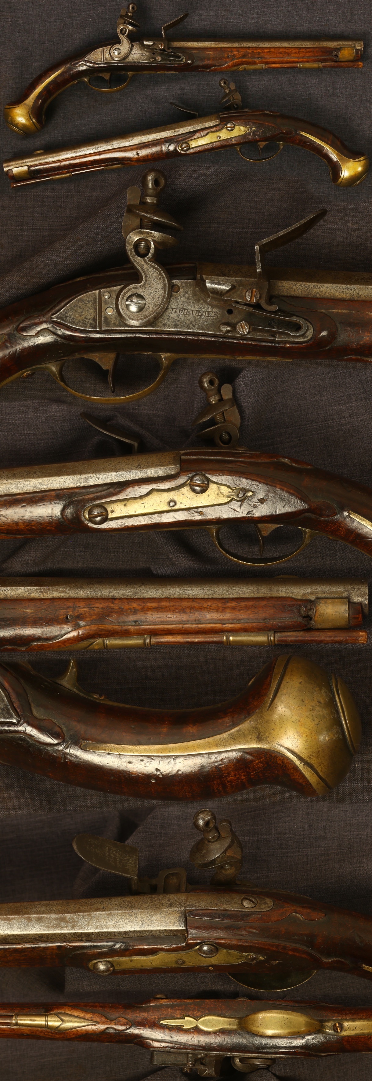 M1733 Liege dragoon flintlock pistol. Marked on lock "H MEUNIER". 11-5/8" barrel with blade front sight. Iron parts have a salt-and-pepper patina overall with light patina on brass. Hammer is an English replacement with matching patina to the rest of the gun. Stock has standard border carvings with an attractive appearance overall showing expected marks from handling, a long crack in the forearm edge in front of the lock, and a minor chip by the forearm band. Hammer clicks but does not have mainspring tension. Sold as a collector item only, not warranted safe to shoot.