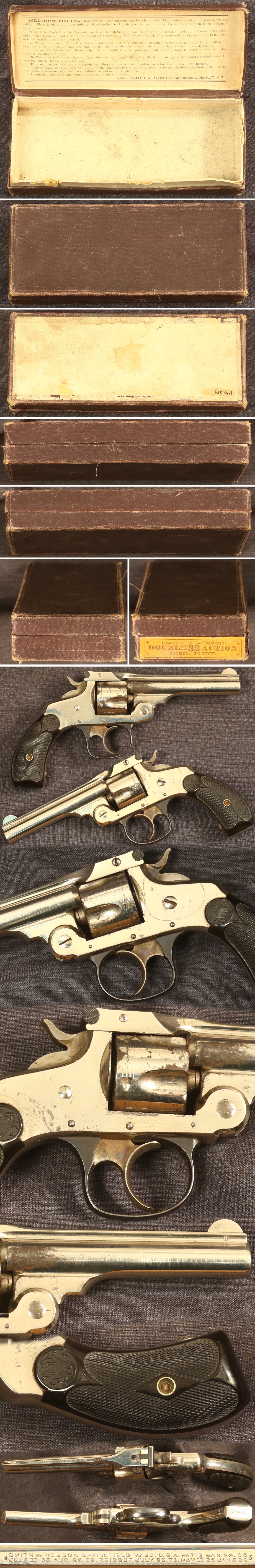 Smith & Wesson 32 double action revolver with factory box. Serial number 37340. 3-1/2" barrel model. Metal parts have bright original nickel finish with minimal scattered patina spots primarily on the cylinder and right side of frame. Fine color casehardened hammer and trigger and blued triggerguard. Hard rubber grips are very fine, free of cracks and chips. Brick-red-brown factory pasteboard box is very good, showing expected wear primarily on edges with a fine label that shows light wear. Mechanically good, sold as a collector item only, not warranted safe to shoot.