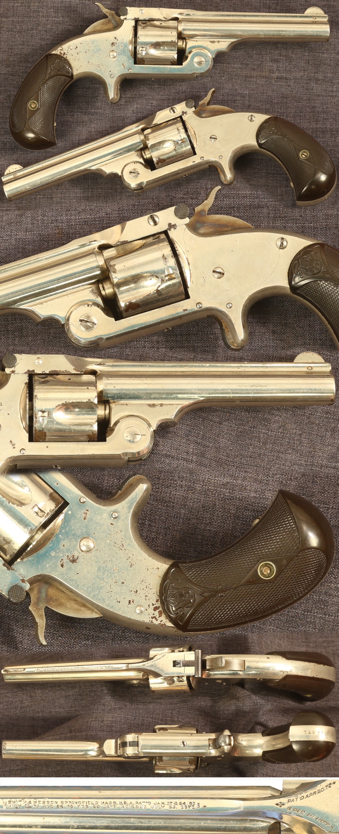 Smith & Wesson No. 1-1/2 single action .32 centerfire revolver. Serial number 84071. 3.5" barrel model with maker and patent marking. Metal parts are mostly a shiny original nickel finish with some light disturbance to the surfaces on the frame, primarily on the right side, a couple minor rust spots and small flakes on the frame, and some flaking on the cylinder, primarily toward the front from powder flash. Hard rubber grips are very fine, free of cracks and chips. Mechanically good, sold as a collector item only, not warranted safe to shoot.
