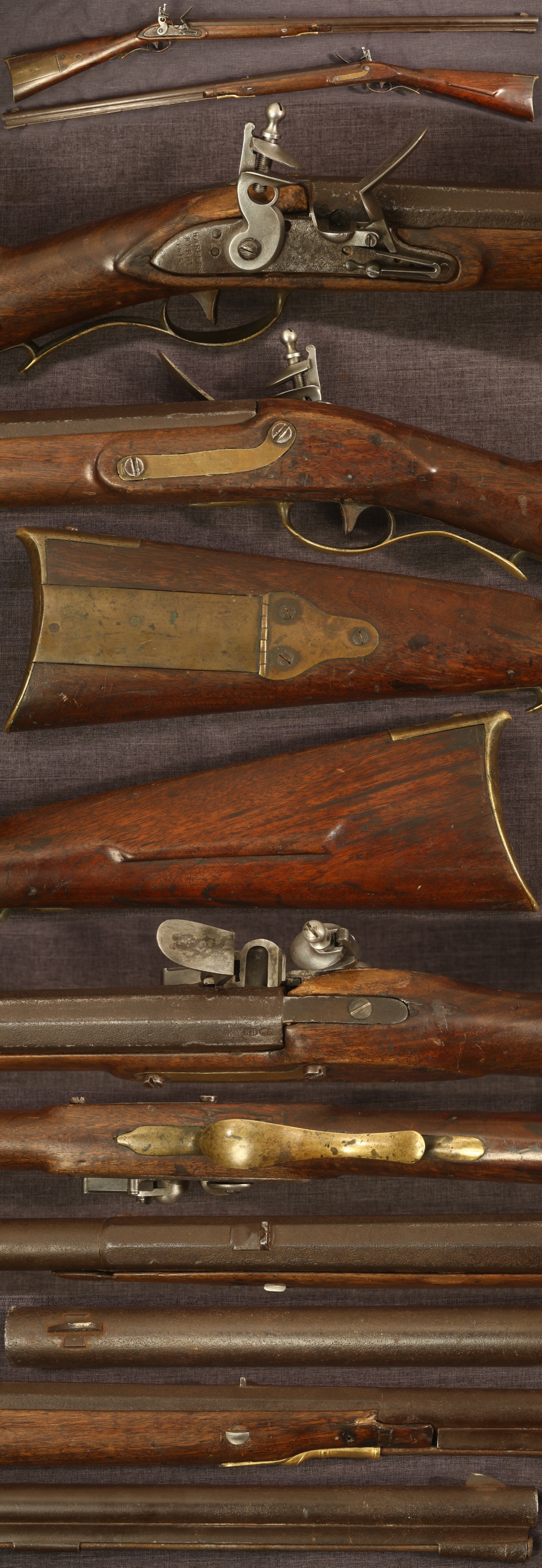 Harpers Ferry M1803 flintlock rifle. Dated 1818 on lock. Barrel shortened to 33-1/4" long, bored smooth to about 0.56". Lock reconverted to flint with reproduction parts. Metal parts show some light pitting and a dark patina that is lighter on the brass. Stock is good, showing average wear and use overall, having a small crack by the rear lock screw, a chip missing from the edge of the right side of the forearm tip and a chip on left side by barrel key. Brass reinforcing strip absent from near tip of forearm. Half cock is functional but doesn't cock fully. Sold as a collector item only, not warranted safe to shoot.