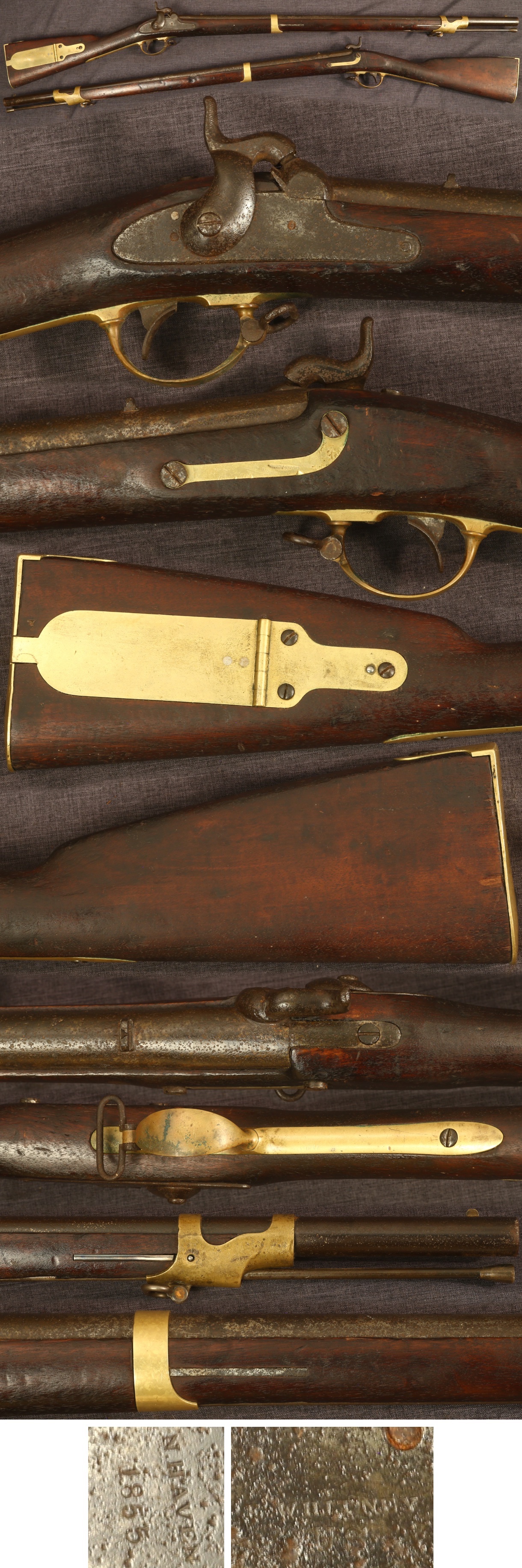 US M1841 "Mississippi" rifle by Robbins, Kendall, & Lawrence, as marked on lock. Markings are very fine, worn, and faint with date unreadable. 33" barrel with original .54 caliber rifled bore. Brass parts have a light coloration, apparently cleaned at some point, iron parts with a dark coloration overall, with some pitting in the barrel breech and lock plate area. We believe the stock is restored from the lower band forward, due to differences in coloration and wear. It is not possible to look for a seam inside the barrel channel, as the stock has been glass bedded for shooting accuracy. Rear of stock is worn with scattered handling marks, small crack by front lock screw, a little erosion behind the hammer from powder burn, and two fine, worn inspector cartouches. Forestock is less worn with few minor marks. Mechanically good, sold as a collector item only, not warranted safe to shoot.