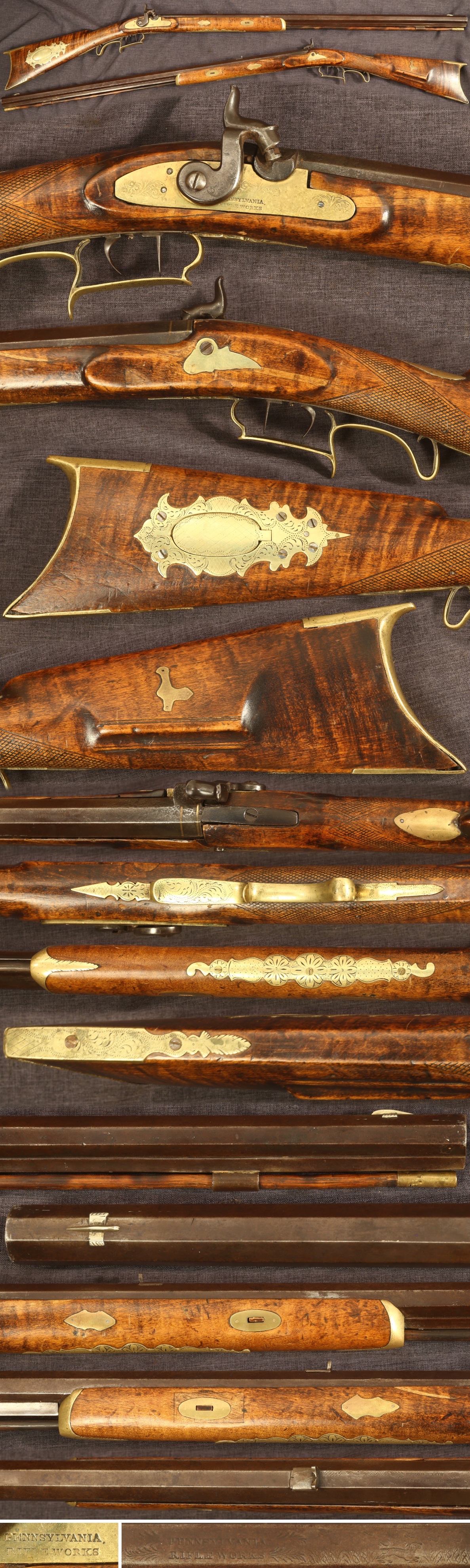 C1860 Pennsylvania Rifle Works, as marked on lock and barrel, halfstock percussion rifle. This company was operated in Philadelphia, PA by owner G. Dunlap. Mostly known for simple, plainly made rifles, this one is unusually fancy. 31-1/2" octagon barrel of about 0.39" bore, brass inlaid bands at breech, 15/16" width. Unusual brass lockplate, parts are nicely engraved including very fancy patchbox. Barrel has a dark patina with some pitting in the barrel breech area. Brass parts are lightly cleaned to a yellow coloration. Curly maple halfstock is checkered in the wrist, shows average wear and use, having small pieces of carefully inlet replaced wood, including several opposite the lock, a sliver in front of the lock, and a rectangle around the left barrel key escutcheon. Nice antique handmade ramrod with brass tip. Mechanically good with set triggers. Sold as a collector item only, not warranted safe to shoot.