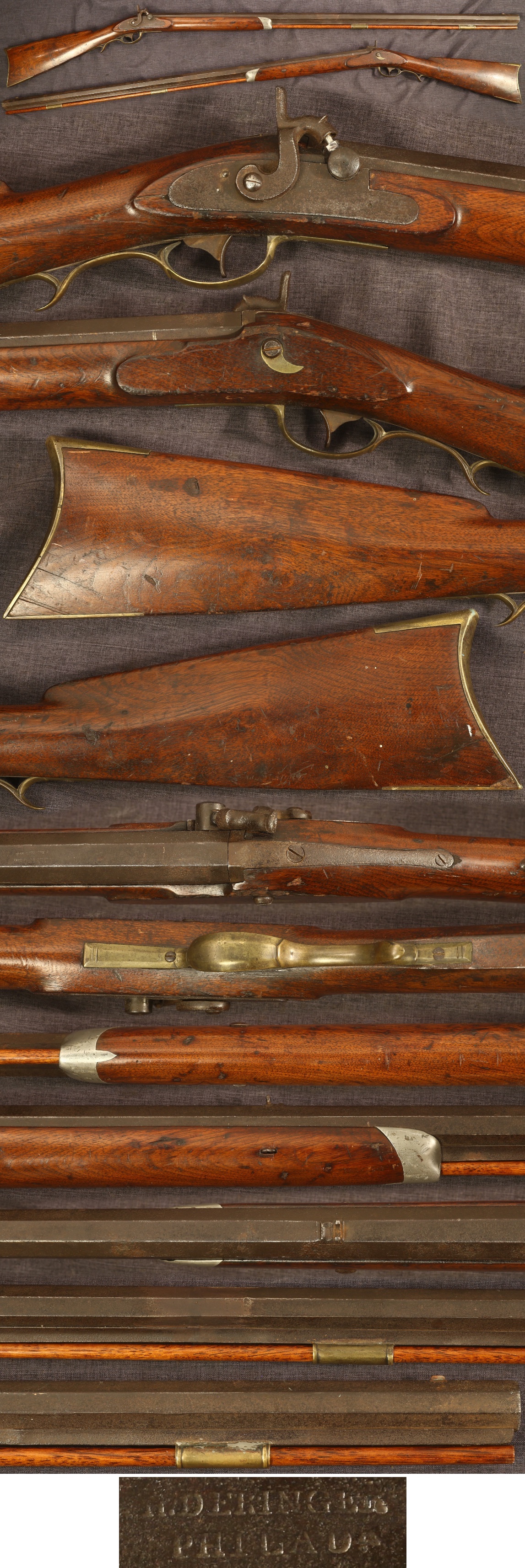 C1850 percussion plains rifle by prolific manufacturer Henry Deringer of Philadelphia, Pennsylvania. 39-3/4" octagon barrel of about 0.55" bore and 1" width. Marked on top of barrel "H.DERINGER/PHILADA". Plainly made, moderate weight, large bore rifle typical of those preferred for western migration. Metal parts have a medium to dark patina with some pitting on barrel and lockplate. Stock shows moderate handling marks from wear and use, has some grain cracks below the rear of the lock, small chip at rear of barrel tang, a couple grain cracks at rear of butt and tiny replaced chip at toe of butt. Nipple is a modern replacement. Mechanically good, sold as a collector item only, not warranted safe to shoot.