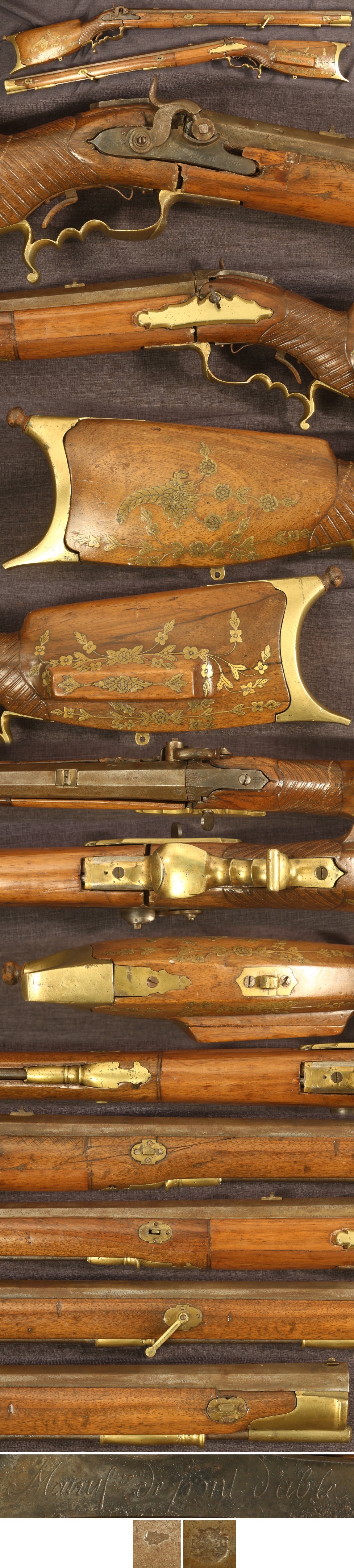 extrafancy Swiss percussion jaeger rifle. Lock is signed in script in French, "Manufre de pont d'able", or Able Bridge Manufactory. Extensively inlaid butt with engraved brass flowers. 28" octagon barrel of about .60 caliber bore, having a width of about 15/16" and a swamped (flared) muzzle about 1-3/16". Metal parts have been cleaned with a light patina and scattered pitting overall. Brass tipped ramrod will not come out. Heavy upper sling swivel present, lower sling swivel absent. Stock is heavily restored, cut and pieced in the lock area and loose, various pieces replaced. Action functions, but front trigger is a makeshift replacement. Sold as a collector item only, not warranted safe to shoot.