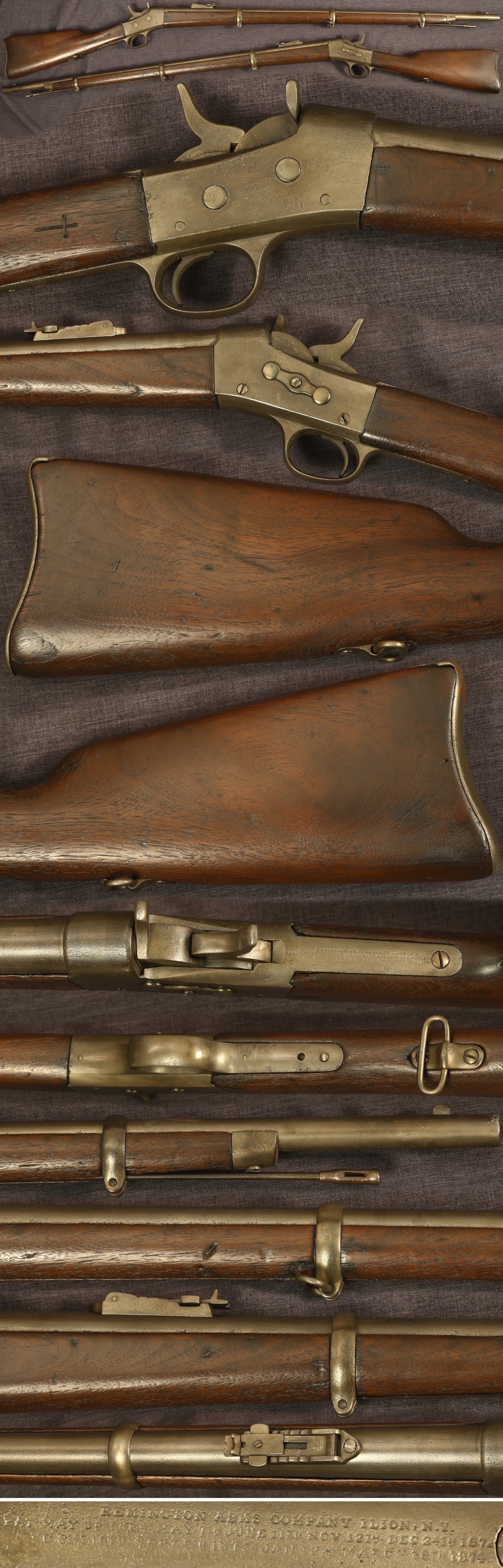 Remington 3-band military contract rolling block rifle. Marked on frame tang with mostly visible 3-line Remington marking. 35" barrel. Metal parts have a light gray coloration overall with a light granular pitting. Walnut stocks are well-worn, has some worn nicks to the cleaning rod channel, a worn chip behind the middle band, and a couple small chips by the frame tang/frame juncture. Functions mechanically but mainspring is a little weak. Sold as a collector item only, not warranted safe to shoot.