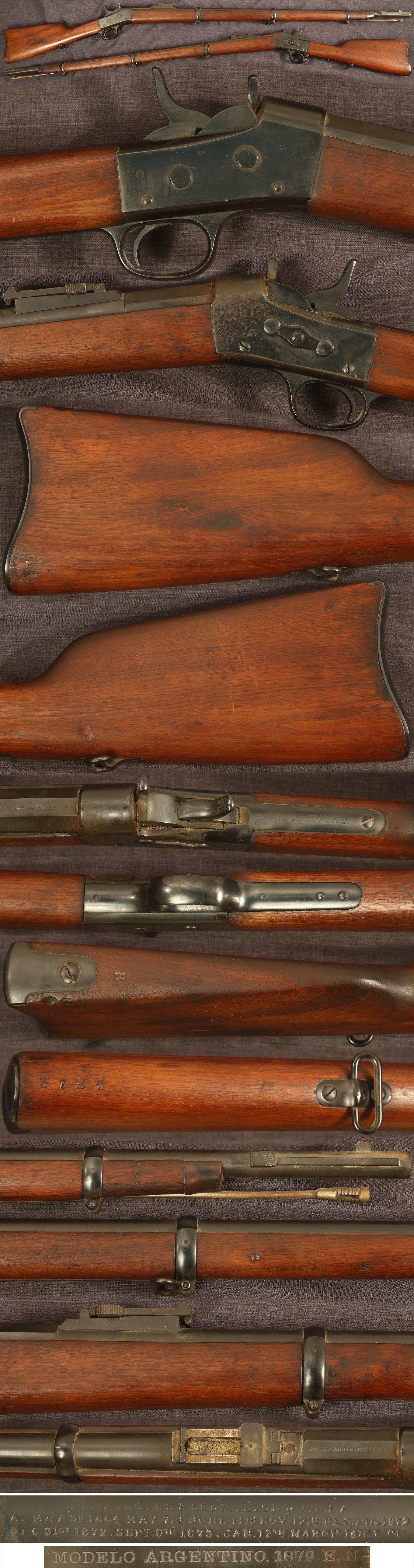 Remington M1879 Argentine rolling block military rifle. Typical state of condition with fine arsenal refinished surfaces. 36" round barrel. .43 caliber. Adapted for sabre bayonet. Remington marking on frame tang mostly visible, showing some wear to the top line. Metal parts have a very fine arsenal blued finish, having dust in places from storage and a small amount of rust on the left side of the breech. Stock is very good as refurbished, wood is still proud to the metal in most places, showing a few scattered moderate handling marks, a small crack to the forearm in front of the right side of the frame, and a small lateral crack in right side of forearm forward of upper band. Mechanically good, sold as a collector item only, not warranted safe to shoot.