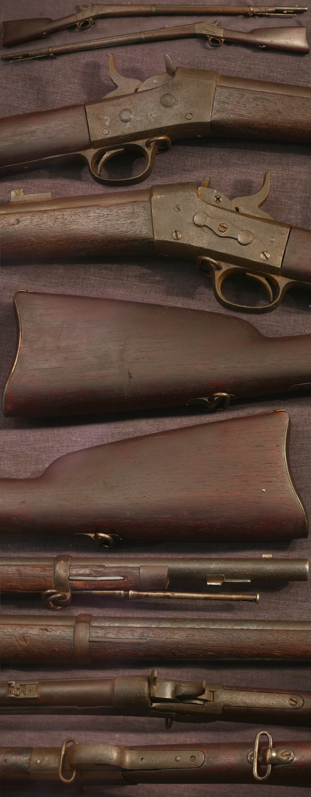 Springfield M1870 USN rolling block rifle. Marked on right side of frame with large eagle and "USN/SPRINGFIELD/1870" and on barrel with anchor. Metal parts have pitted surfaces and dark patina. Cleaning rod replaced with later 45-70 trapdoor style. Stocks have been cleaned, forestock with handling marks. Rear sight ladder absent. Mechanically good, sold as a collector item only, not warranted safe to shoot.