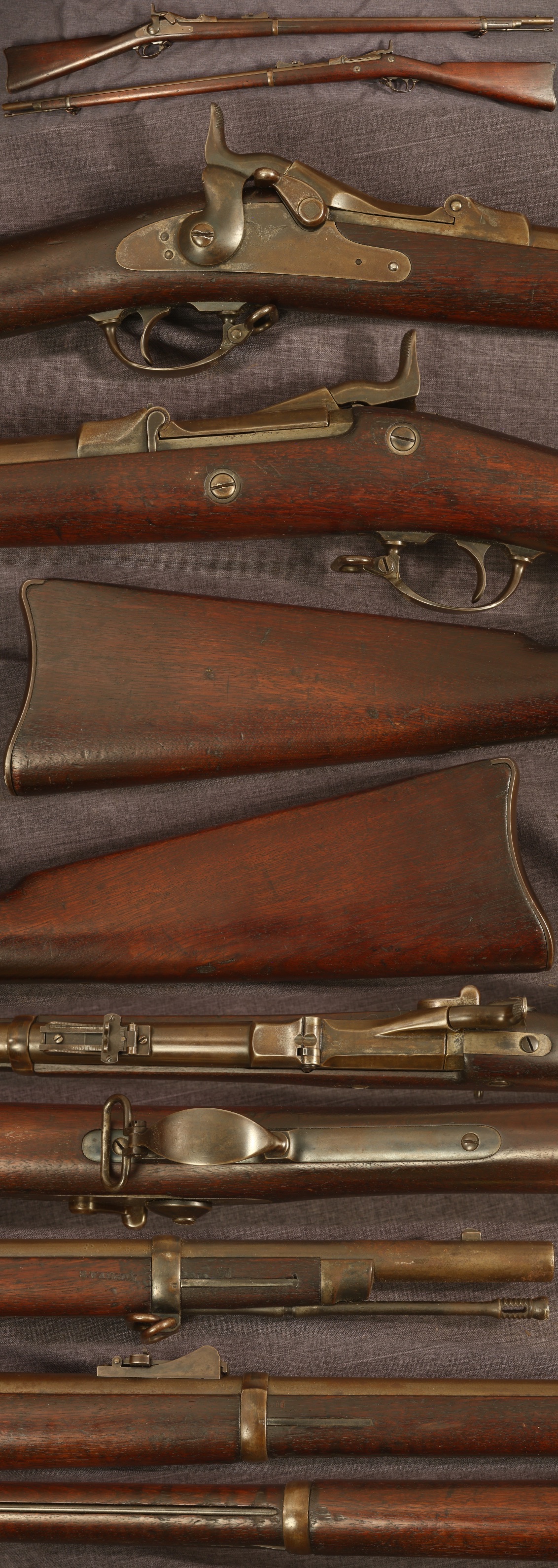 M1873 Springfield .45-70 "trapdoor" rifle. Serial number 65631. Early featured rifle with upgraded rear sight. Metal parts are smooth with a brown and plumb patina. Stock shows smooth wear overall, free of cracks and chips, showing scattered handling marks overall, particularly around the underside by the lower band, from having been rested while being fired.. Has an interesting script "P" cartouche in front of buttplate tang, and owner name "T.VAUGHN" neatly stamped behind upper barrel band. Mechanically good, sold as a collector item only, not warranted safe to shoot.