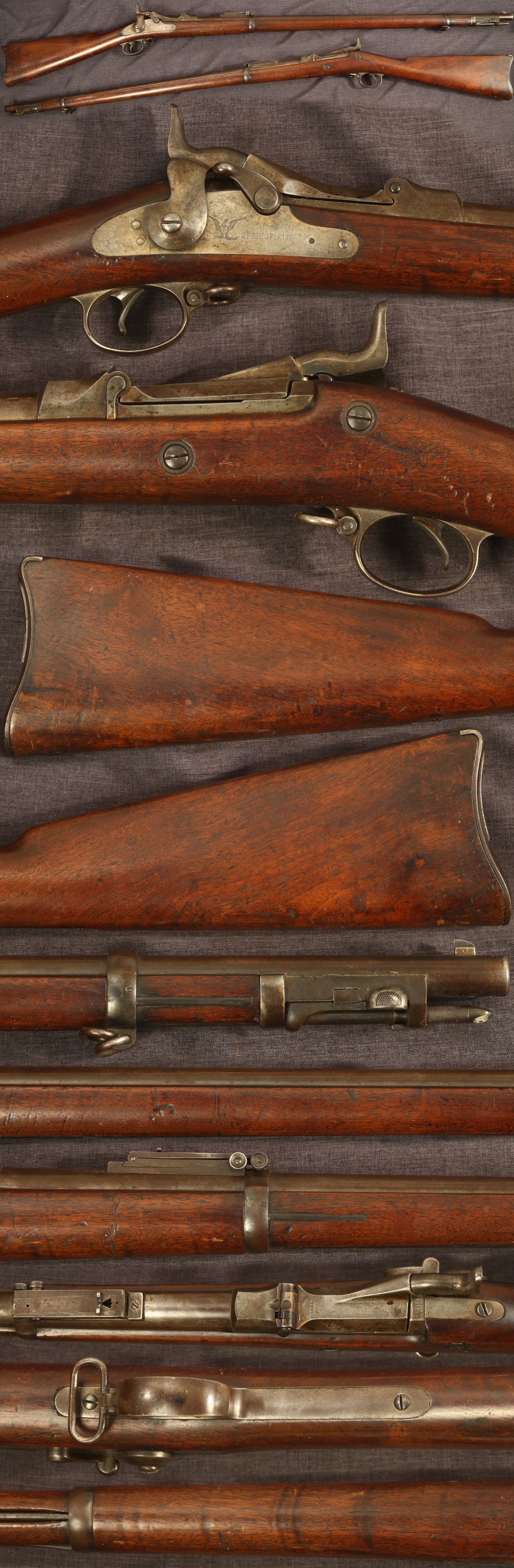 Springfield M1888 .45-70 "trapdoor" rifle with ramrod bayonet. Serial number 526658. Metal parts have a brown patina overall. Stock has a good inspector cartouche dated 1891 and "P" firing proof behind triggerguard. Wood shows average wear and use, uncleaned, free of cracks and chips, showing numerous light to moderate handling marks, including some marks between the triggerguard and barrel band from having been rested while being fired. Mechanically good, sold as a collector item only, not warranted safe to shoot.