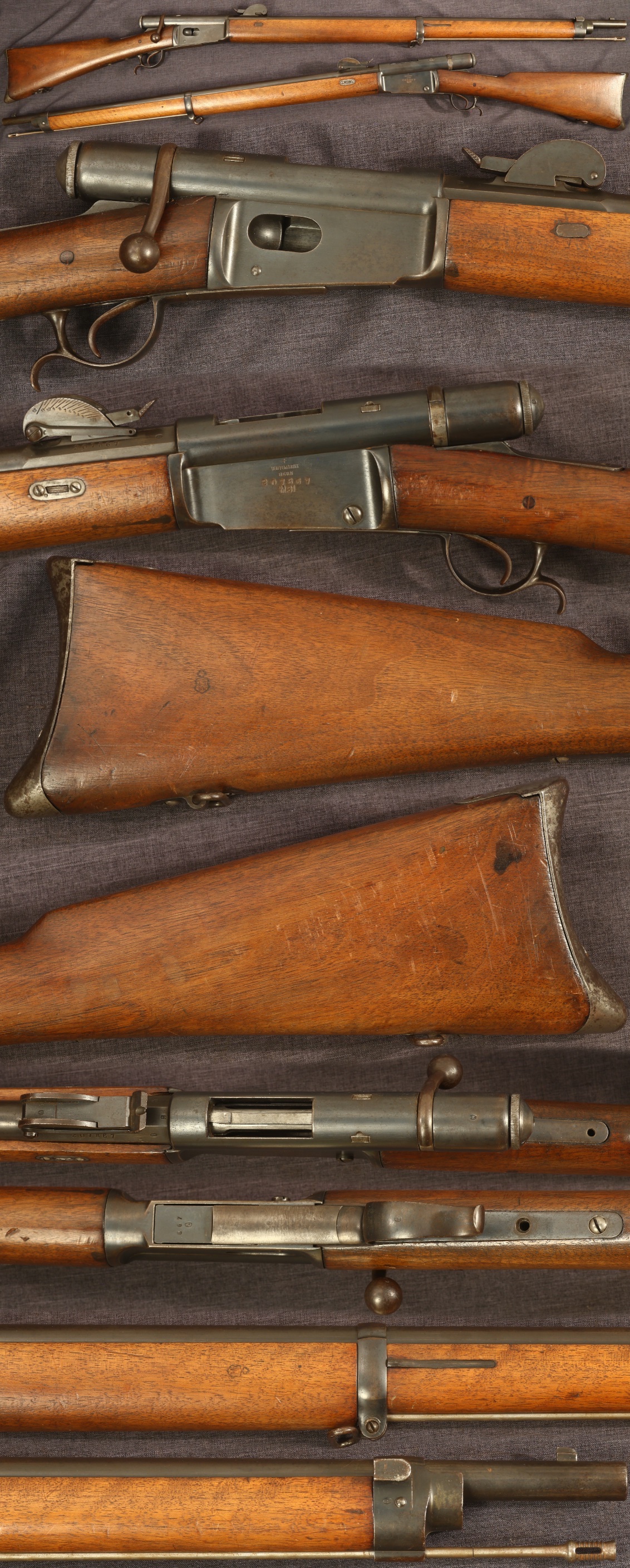 Swiss M1881 Vetterli rifle. Serial number 207867. Metal parts are original blue surfaces with some brown patina present. Cleaning rod is a replacement and lower tang screw is absent. Stock was lightly sanded as evidenced by the light cartouches, has scattered handling marks and a small crack in the wood behind the bolt. Rear sight is missing a spring and a couple screws. Action appears to be mechanically good. Sold as a collector item only, not warranted safe to shoot.