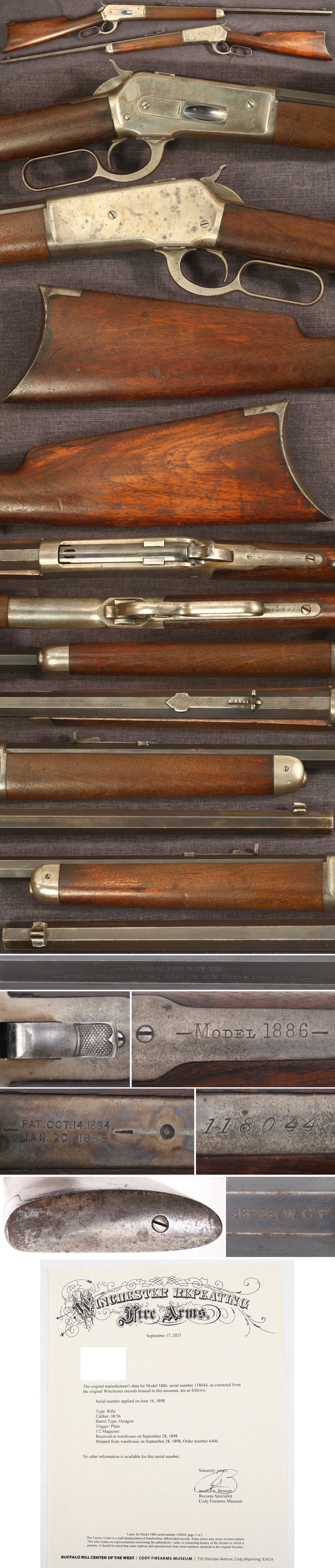 antique Winchester Model 1886 lever action rifle. Serial number 118044, made in 1898. 26" octagon barrel, 38-56 W.C.F. caliber, button magazine configuration. Fine bright bore. 75% thin original blue finish on barrel shows loss on edges with scattered freckles turning a dark gray-brown patina, receiver shows gray patina with some swirls of original color casehardening. Has widows peak style knurled hammer, steel crescent butt plate and forearm nose cap. Stocks show average handling with shallow dents and scratches, and a minuscule chip on top right side of wrist at base of tang. Comes with a Cody Museum factory letter confirming features. Mechanically good, sold as a collector item only, not warranted safe to shoot.