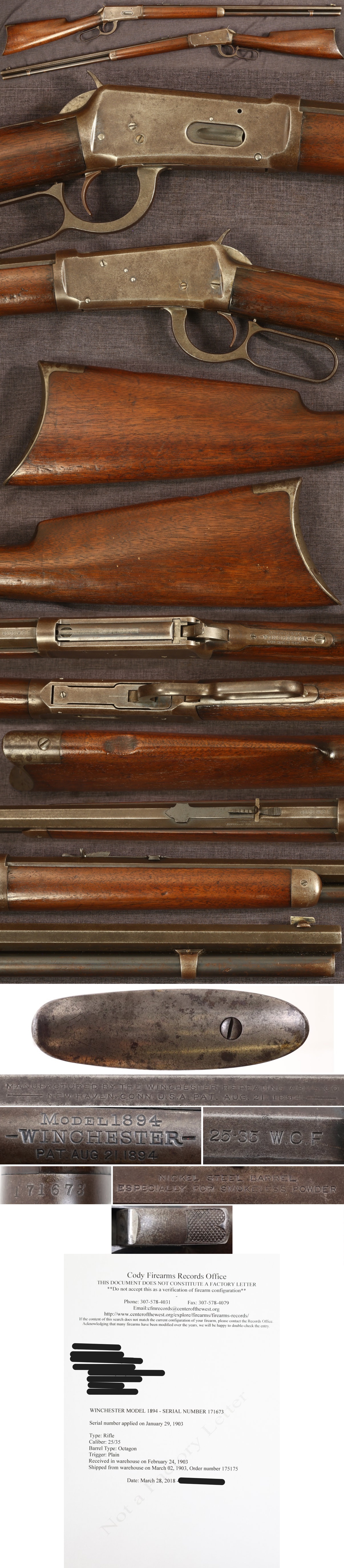 Winchester Model 1894 lever action rifle. Serial number 171673, made in 1899. 26" octagon barrel, 25-35 WCF caliber. Fair bore is clean with defined rifling showing some erosion. Lettering is all easily readable, showing light wear and use. Dark gray patina overall with some plumb patina. Late 19th century production with widows peak knurled pattern hammer, steel crescent butt plate and forearm nose cap. Buttstock and forearm show older refinish with shallow dents and scratches, edges of wood even with metal to just slightly proud with a good appearance. Has an old smoothed down chip near the heel of the butt and a couple of minuscule chips along upper tang. Comes with Cody museum search response. Ships to FFL dealer or C&R license holder where eligible. Appears to be mechanically functional. Sold as a collector item only, not warranted safe to shoot. Before considering using this arm, we recommend inspection by a professional gunsmith.