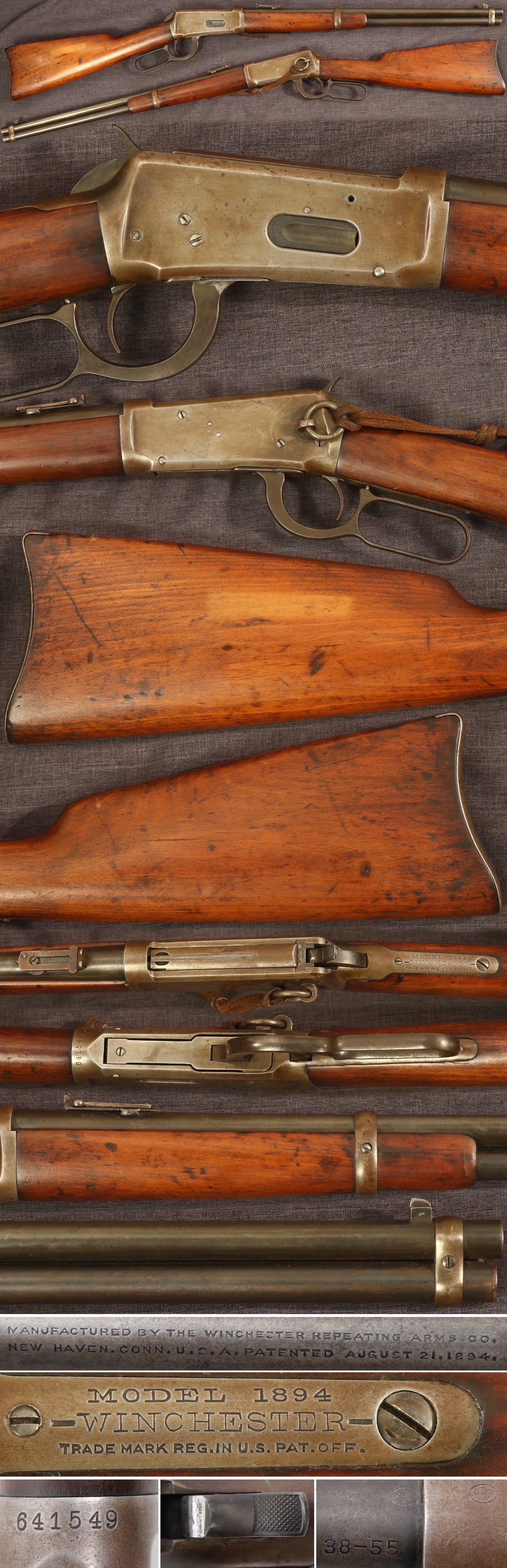 Winchester Model 1894 lever action saddle ring carbine. Serial number 641549, made in 1912. 20" round barrel, 38-55 caliber. Fair bore with some with some soiling that didn't brush out, exhibiting erosion probably from having been used with blackpowder cartridges. Medium to dark gray patina with some plumb, flip up rear ladder sight, knurled pattern hammer, steel saddle ring and stud on left side of receiver. Buttstock and forearm show average handling with shallow dents and scratches and a small crack on top right side of wrist at base of upper tang and a small air check on left side of butt stock. Ships to FFL dealer or C&R license holder where eligible. Appears to be mechanically functional. Sold as a collector item only, not warranted safe to shoot. Before considering using this arm, we recommend inspection by a professional gunsmith.