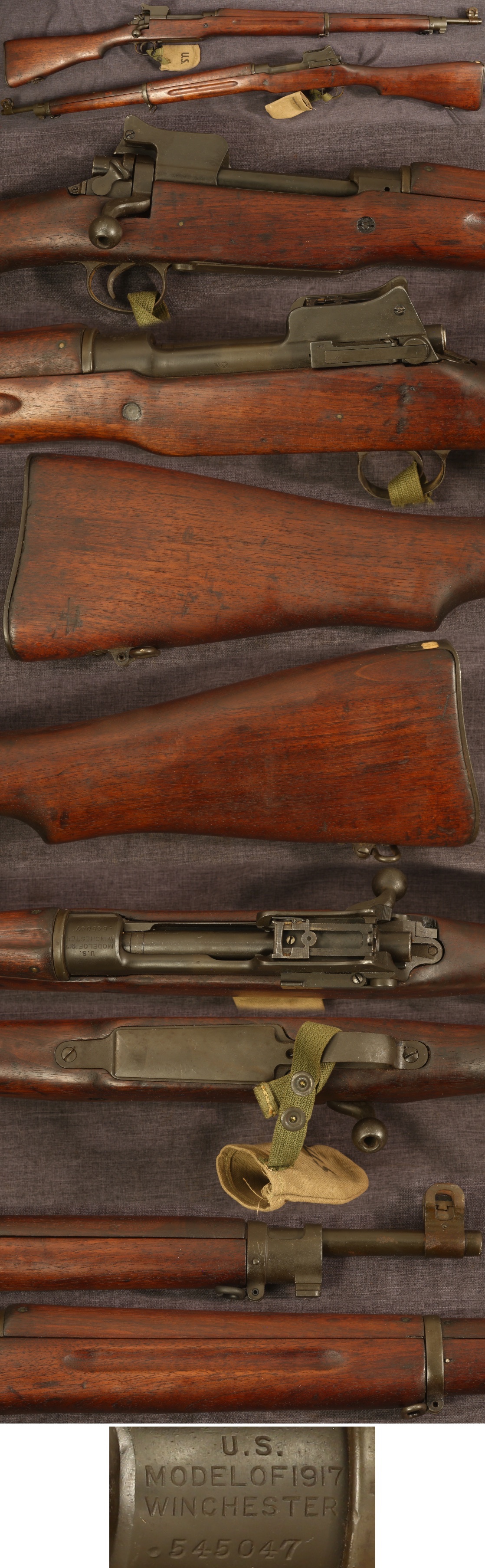 M1917 Winchester .30-06 rifle. Serial number 545047. Winchester barrel dated 12-18. Most other marked parts observed are marked "E". Metal parts are fine, showing some storage rust near the muzzle from having been kept with the muzzle cover on. Stock has a few moderate marks that are worn down after having been lightly sanded some time ago. Comes with a web muzzle cover marked "TWEEDIE 1944". Ships to FFL or C&R license holder. Appears to be mechanically functional. Sold as a collector item only, not warranted safe to shoot. Before considering using this arm, we recommend inspection by a professional gunsmith.