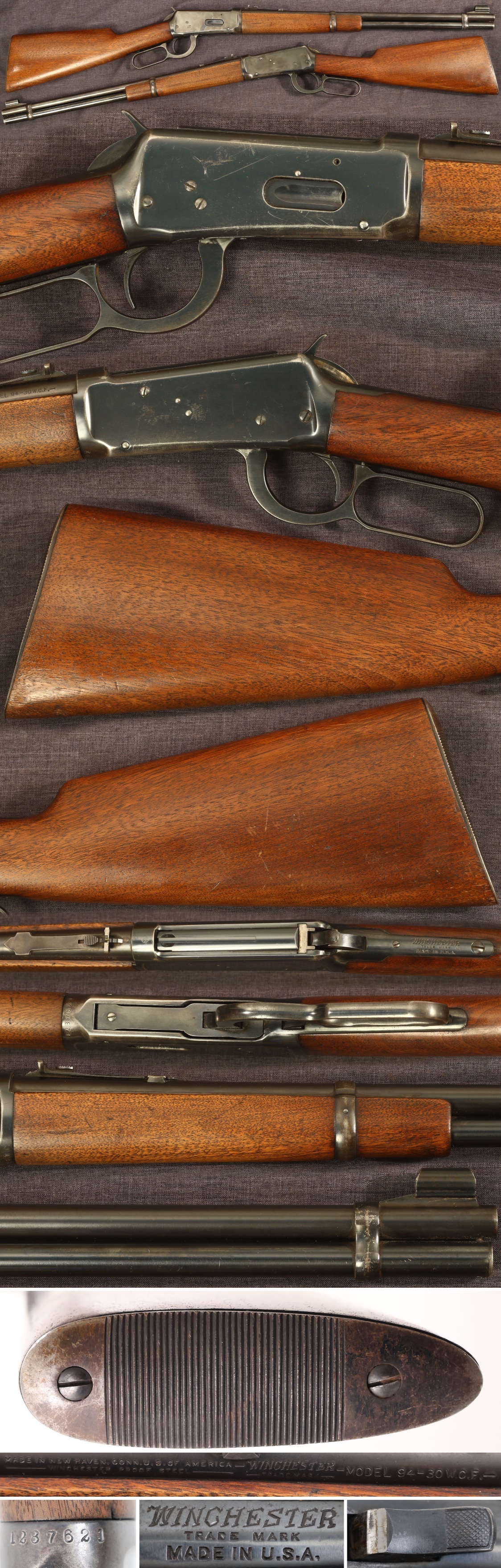 Winchester Model 94 lever action carbine. Serial number 1287621, made c1942-45. 20" round barrel, 30WCF (.30-30) caliber. Bore is good, clean, showing some use. Lettering is all sharp, so 85% blue finish is believed to be original, showing general thinning with loss on barrel bands and carry points. Wartime production carbine with hooded front sight, knurled pattern hammer, and serrated steel but plate. Buttstock and forearm show light average handling with small chip at rear of upper tang and a few shallow dents and scratches. Ships to FFL dealer or C&R license holder where eligible. Appears to be mechanically good. Appears to be mechanically functional. Sold as a collector item only, not warranted safe to shoot. Before considering using this arm, we recommend inspection by a professional gunsmith.