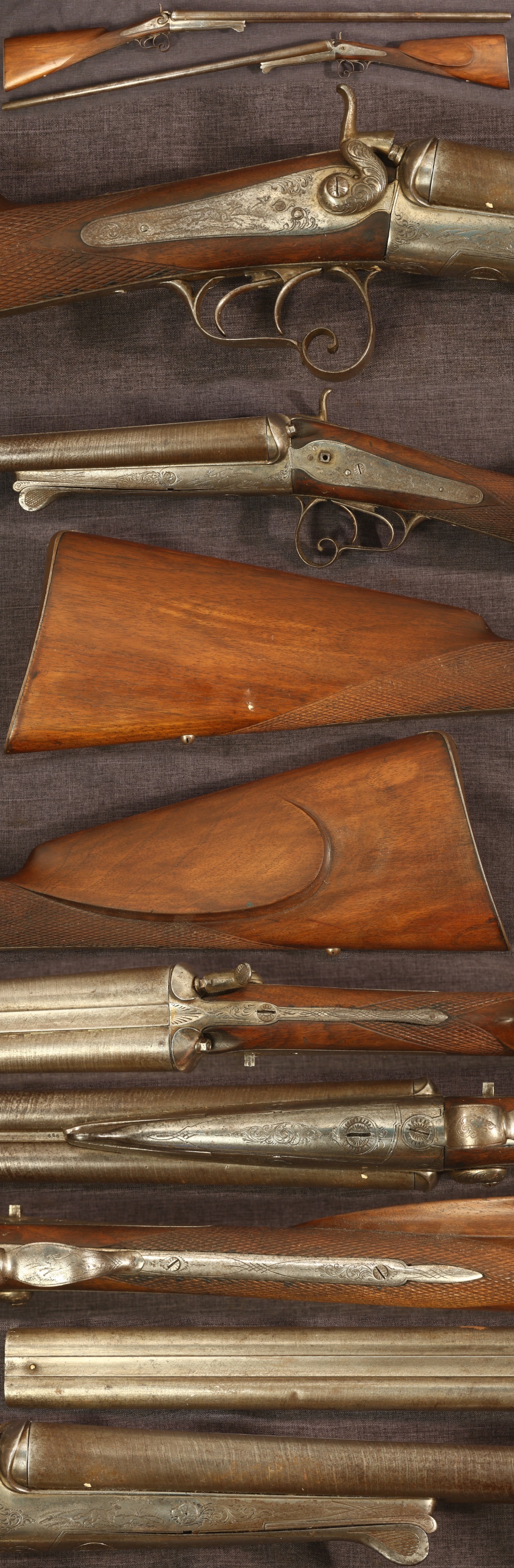 fancy Belgian double barrel cartridge shotgun. 29-13/16" barrels, appears to be 16 gauge. No maker markings. One hammer is absent. Frame and locks are lightly cleaned and have attractive engraving. Barrels have a striped twist finish. Stock appears to be lightly cleaned with freshened checkering, free of cracks and chips. Sling swivels are absent. Right lock is mechanically good. Sold as a collector item only, not warranted safe to shoot.