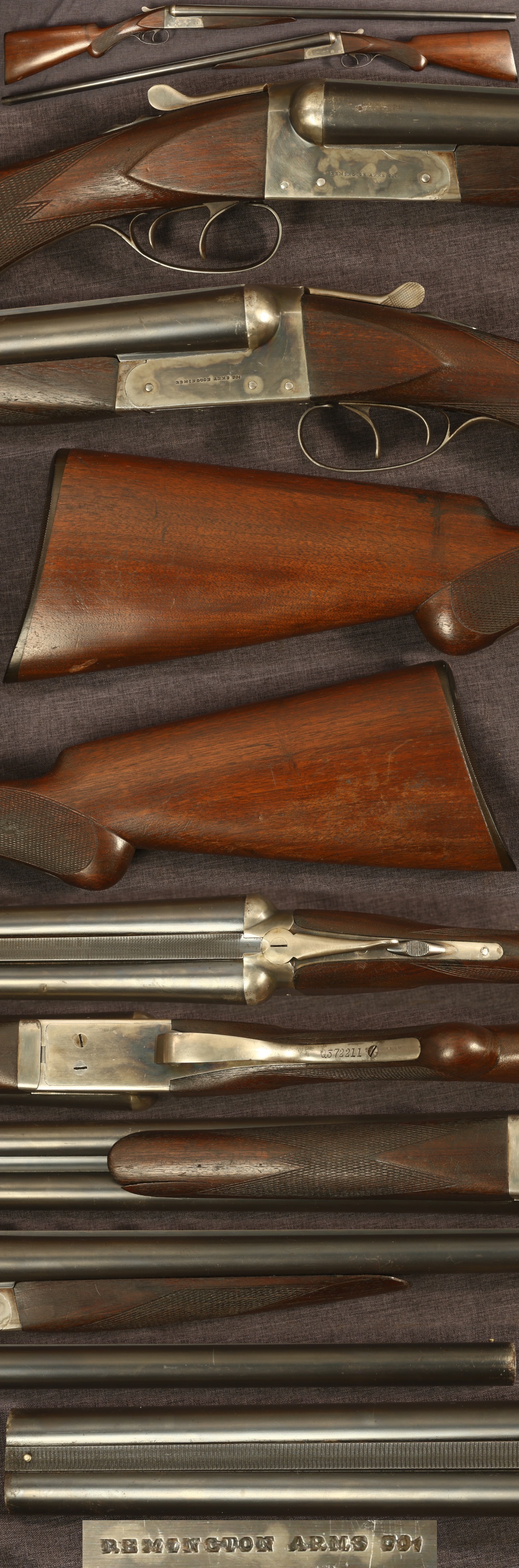Remington M1900 K grade hammerless double barrel shotgun. Made in 1908, serial number 372211. 30" barrels, 12 gauge. Barrels have fine blue finish with some small spots of granularness from rust removal. Frame has fine color casehardening. Stocks are very good, showing little wear or use, having an about 2-1/2" grain crack from the tip of the forearm and a handling mark in the right side of the butt near the toe. Ships to FFL or C&R license holder. Appears to be mechanically good, sold as a collector item only, not warranted safe to shoot.