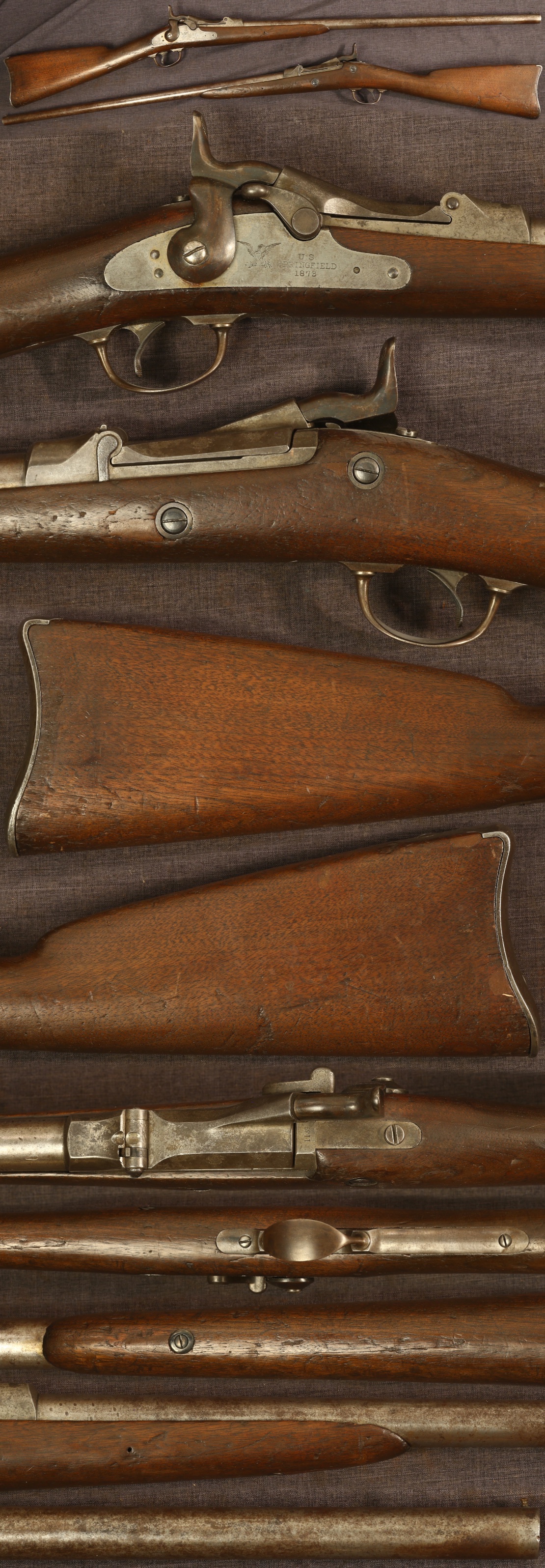 Scarce M1881 Springfield "trapdoor" forager shotgun. Serial number 1139. Correct, original gun with 1881 dated breech block, 1873 dated lock, carbine triggerguard, and stock made from civil war musket stock with ramrod channel plugged. Metal parts have a mottled light patina overall. Stock has a visible 1883 dated cartouche with wood showing a good deal of wear and use overall, as usually observed on this model. Wood has numerous dings from handling and use but is structurally sound. Has one small filled spot in front of front lock screw opposite lock. Mechanically good, sold as a collector item only, not warranted safe to shoot.