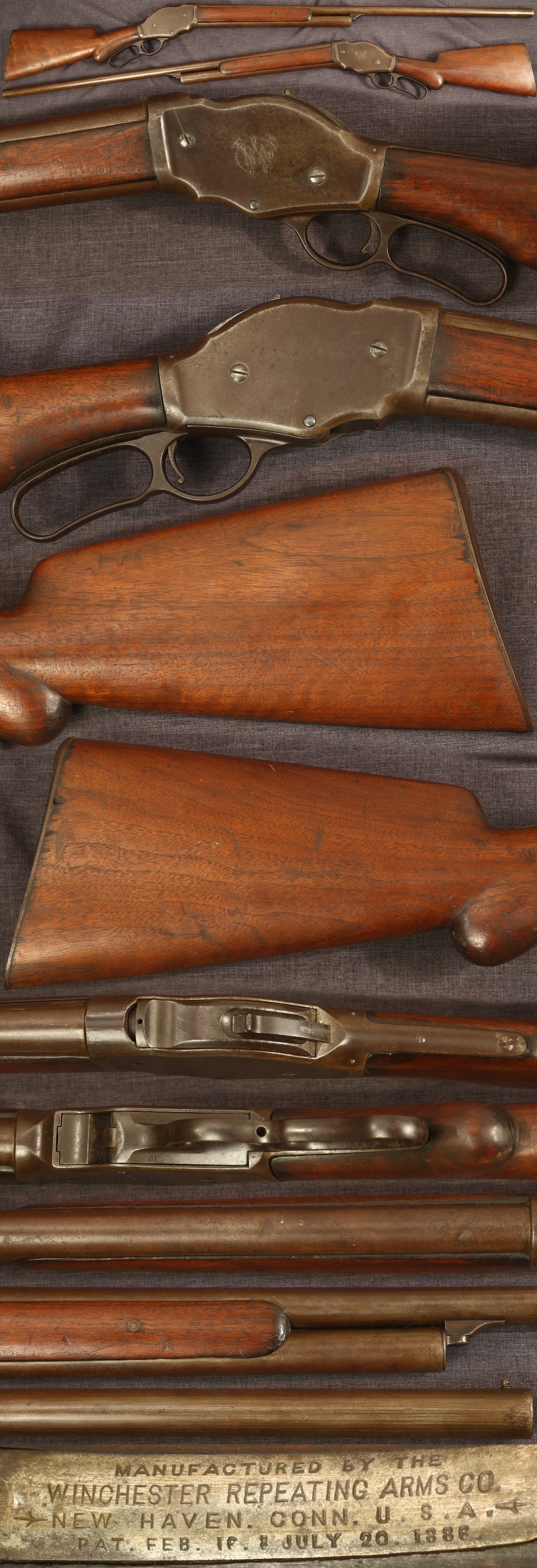 Winchester M1887 lever action shotgun. Serial number 27157, made in 1890. 12 gauge, 32" barrel. Standard markings and brass bead front sight. Metal parts have a smooth attractive medium patina overall, has a couple small dings in the magazine tube and some tool marks near the barrel breech. Wood is evenly worn, having some scattered handling marks and minimal evidence of having been lightly cleaned, also some very minor chipping around the buttplate. Mechanically good, sold as a collector item only, not warranted safe to shoot.