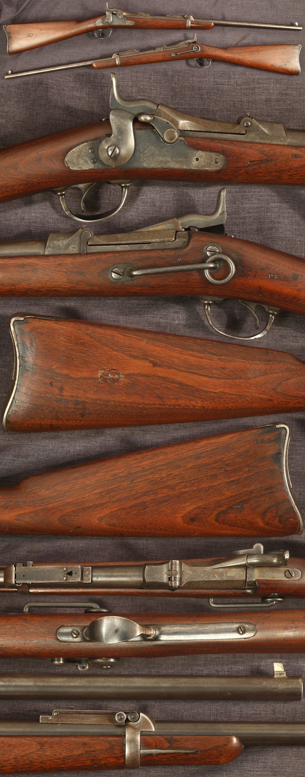 Springfield M1884 .45-70 assembled carbine. Serial number 540564. Modified skillfully from a rifle using a correct buttplate with trap, "C" marked Buffington rear sight, carbine barrel band, and ring bar/ring. Triggerguard bow is altered to carbine configuration from rifle. 23-1/4" barrel is a little long but presents the opportunity to slightly shorten, crown the muzzle, and apply a correct rear sight blade/base. Metal parts are mostly a plumb blue finish mixing with patina, and some pitting on the gray buttplate. Rifle stock with 1892 inspector cartouche altered to carbine configuration, wood has several added stamped letters, lightly cleaned and refinished, showing scattered minor marks, free of cracks. Has original armory marks, possibly New York, with "9 K 87" on heel of buttstock and "9" in right side of buttstock. Mechanically good, sold as a collector item only, not warranted safe to shoot.