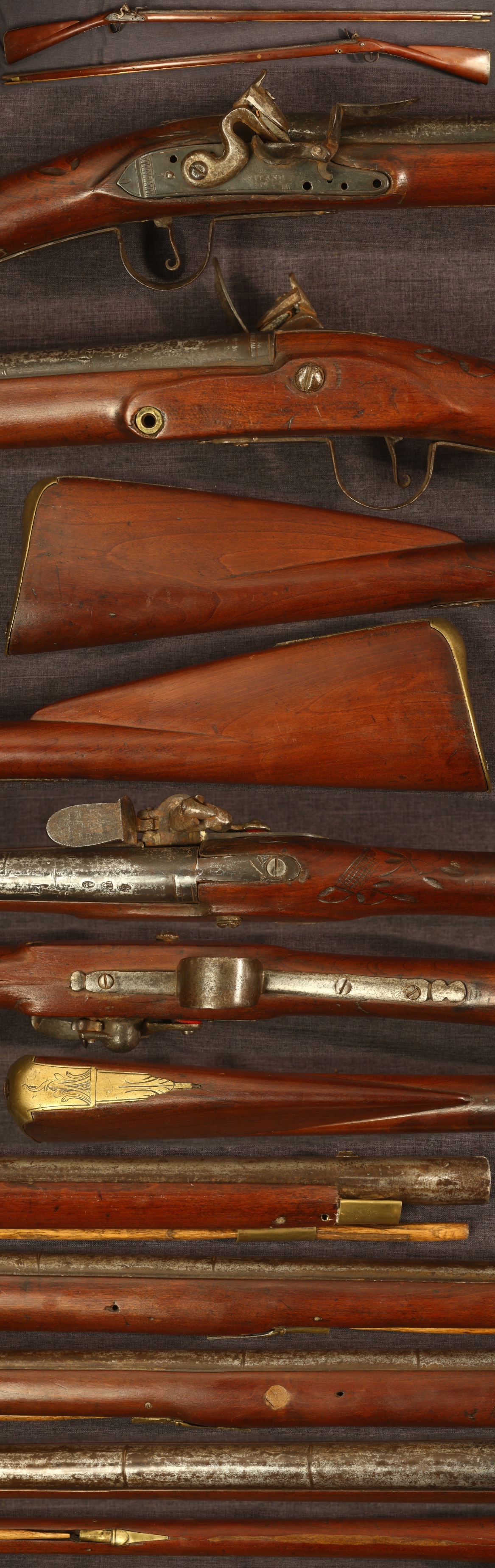 Early flintlock longfowler with Ketland & Co trade lock. Early 45-3/4" round barrel with "two stage" ring transitions. Marked at breech with British proof marks and an early maker mark that may be "IH". Metal parts are partially cleaned and partially in patina. Lock is absent frizzen spring and internal parts, one lock screw is absent. Stock appears to have been done later, but with an early butt profile. Wonderful handmade early American triggerguard with early curled trigger. Ramrod is a replacement that is too short. Stock may have been lightly refinished, has a small crack in the right side of the wrist, has a long filled sliver in front of the triggergard, small filled circle in left side of forearm, a filled sliver to right side of ramrod channel, and a couple forearm chips. Does not function mechanically. Sold as a collector item only, not warranted safe to shoot.