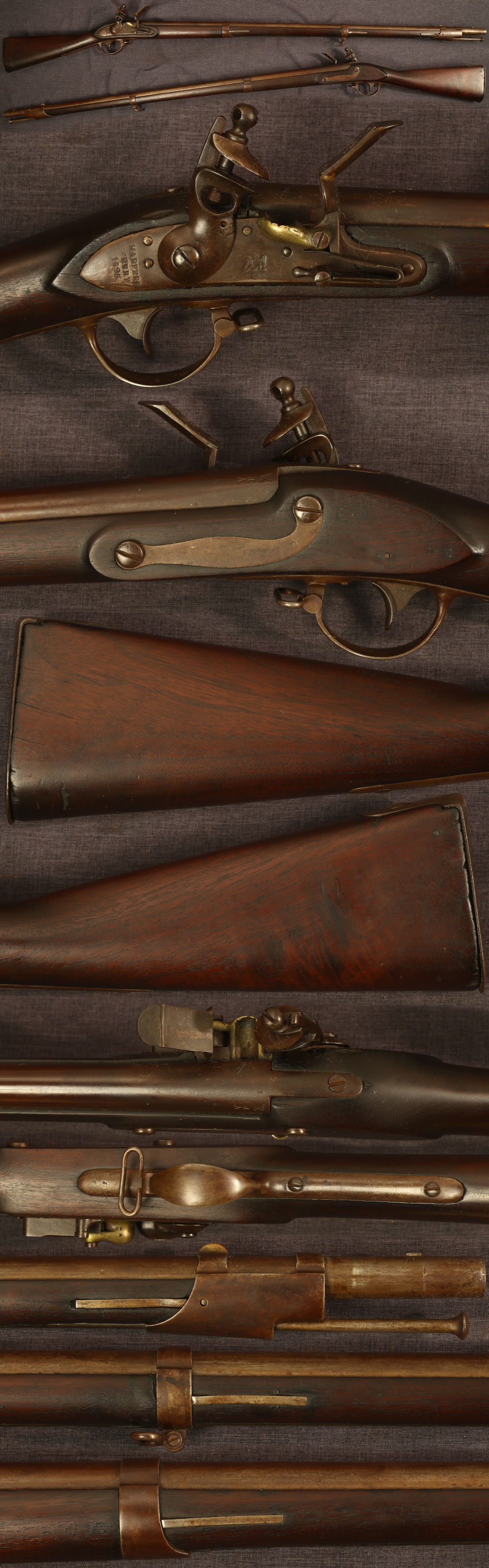 M1816 Harpers Ferry Type II flintlock musket dated 1825 on lock. Harpers Ferry proofs on barrel and in wood opposite lock with cartouche and inspector letters. Metal parts have an attractive brown patina evocative of original brown finish. Inspector initials are present on a number of metal parts. Stock shows light wear and use overall, having been lightly cleaned, with a small crack by the rear lock screw, small sliver missing to left of barrel tang, and some minor chipping to ramrod channel and adjacent to buttplate. Mechanically good, sold as a collector item only, not warranted safe to shoot.