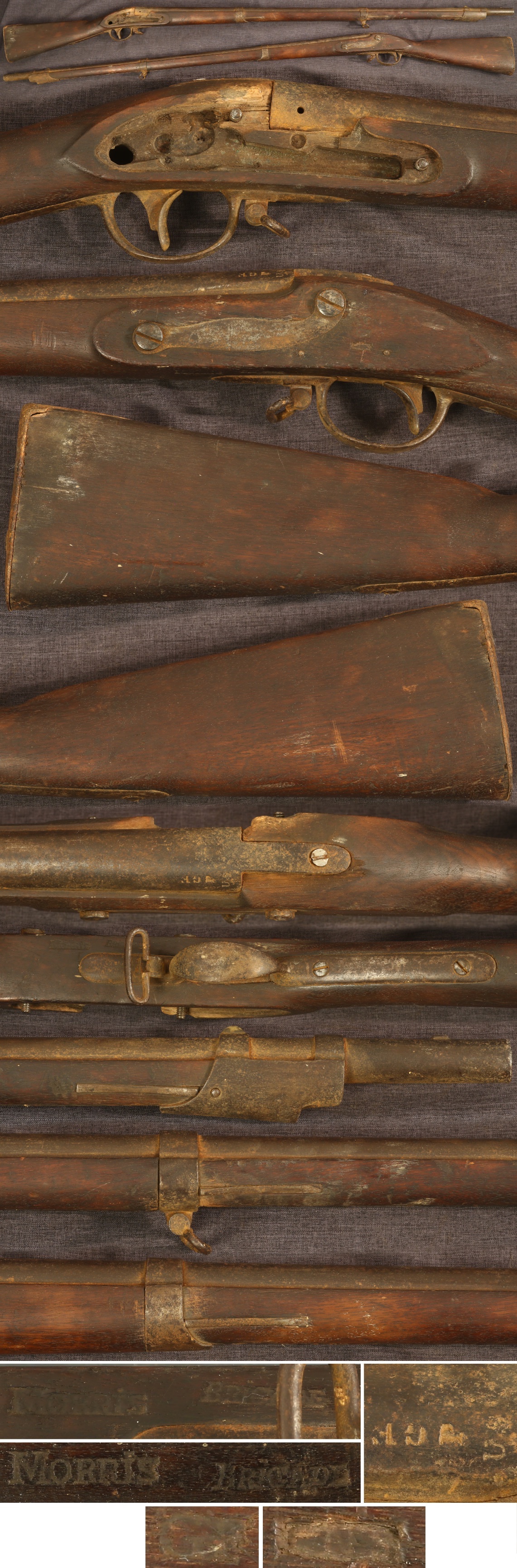 M1816 flintlock contract musket with New Jersey "ESSEX BRIGADE" militia markings. The origin of the Essex Brigade is in 1775, serving in the American Revolution. After the war, it was reorganized into the New Jersey militia, later taking the Essex Brigade name back on. 42" barrel with proofs in breech, stock proofed opposite lock mortise "GF" and in deep cartouche that is believed to be "SNJ". Additionally, it is boldly marked "ESSEX BRIGADE" adjacent to the triggerguard and in the toe of the butt. Metal parts are an untouched rust patina with some heavier rust on the buttplate from having been set there for many years. Stock is good, showing only light use, having some minor chipping to the ramrod channel and a small piece of wood missing from left of barrel tang. Sling swivels are stuck in place. This musket has an interesting history and needs only a lock and ramrod to be complete. Sold as a collector item only, not warranted safe to shoot.
