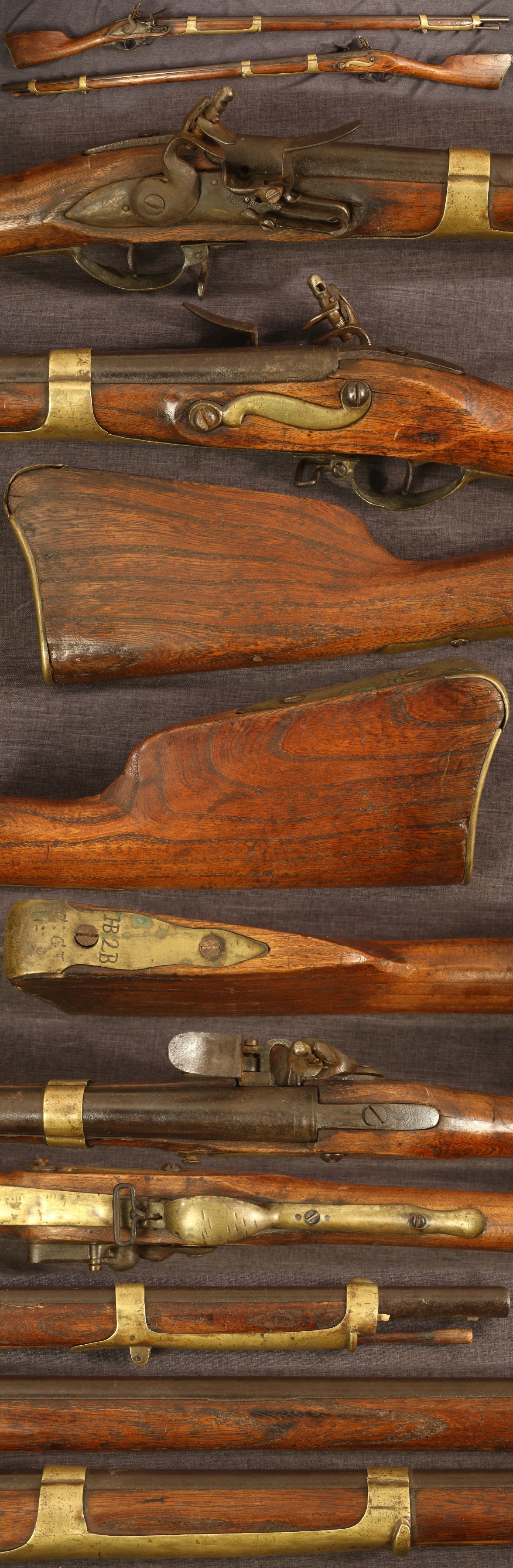 C1770 American assembled musket of Dutch-Germanic parts. 41-3/16" barrel of about .69 caliber bore. Equipped with two large double strapped brass bands. Unit marked on buttplate tang. Buttplate is well-worn with a crack by one of the attaching screws. Brass parts were cleaned at some point, iron parts have a dark patina with some expected pitting in the flash hole area. Stock appears to be of chestnut, has an unusual profile to the butt, shows average wear and use overall with a small chip at front of lock, crack by rear lock screw, and a sliver from the right forearm edge. Nice antique wooden ramrod. Mechanically good, sold as a collector item only, not warranted safe to shoot.