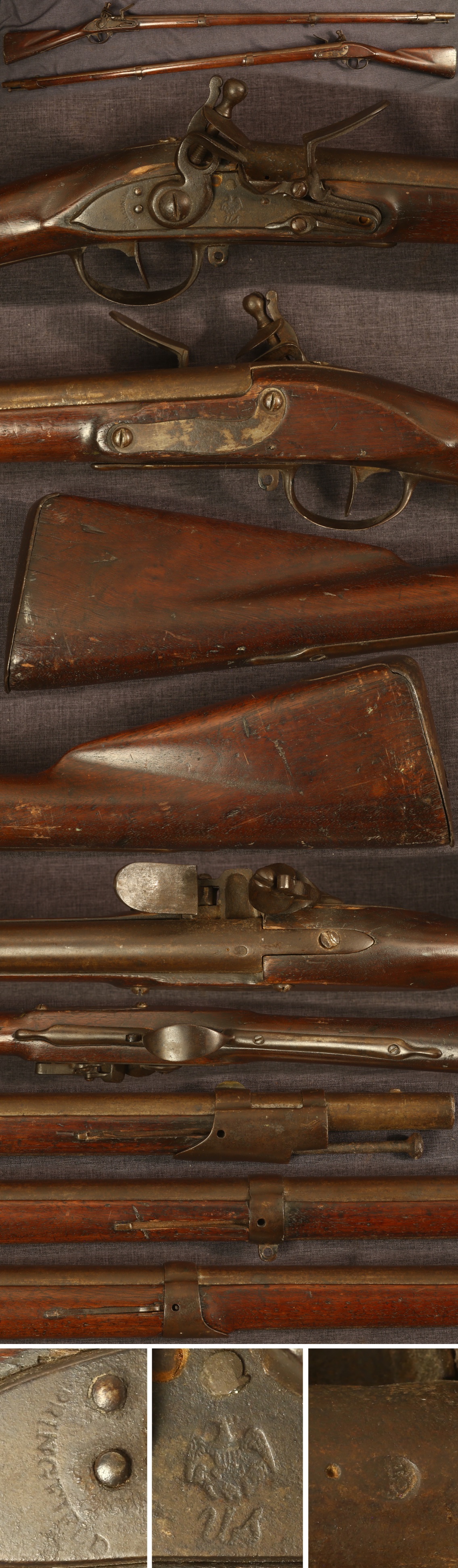 M1795 Type I flintlock musket with earliest, vertical SPRINGFIELD marking at rear of lock as used from 1799-1802. Wonderfully strong lock markings. 44-1/2" contract proofed round barrel. George Moeller notes that due to the exigencies of the War of 1812, new production at Springfield ceased for a period while muskets stored for repair were attended to, and various leftover older parts were built into muskets, resulting in guns that don't fit the "standard" descriptions, which could explain the use of a non-Springfield barrel. Overall patina and pitting in the pan and flashole area are consistent with always having been together. Metal parts have an uncleaned patina overall with aforementioned pitting. Middle and upper barrel band springs are absent. Stock shows honest wear and use overall with minuscule cracks by rear lock screw and in front of lock. Frizzen spring screw shows an interesting old blacksmith repair.