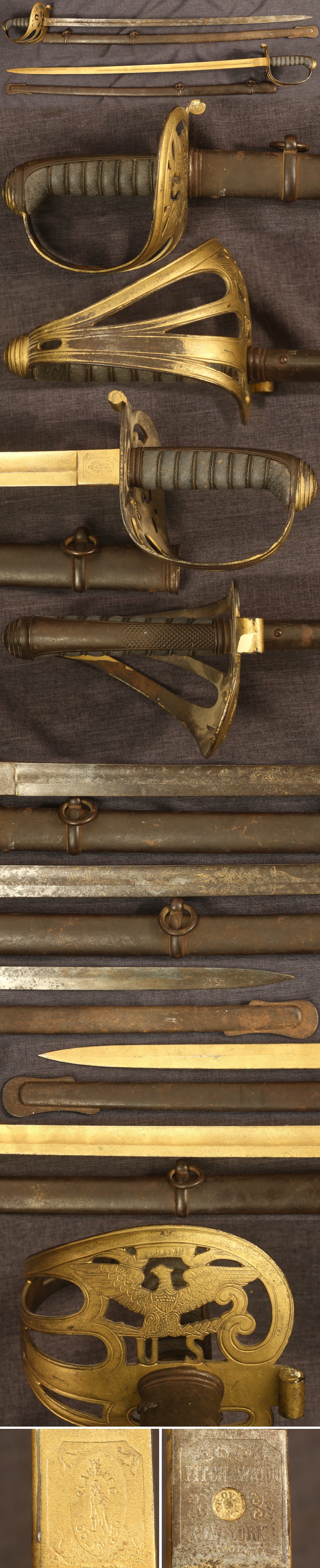 | C1830 Ames knighthead sword with engraved brass scabbard, interesting Mexican motifs on blade of eagle with snake and Phrygian cap with rays | Excellent | $1950.00 |