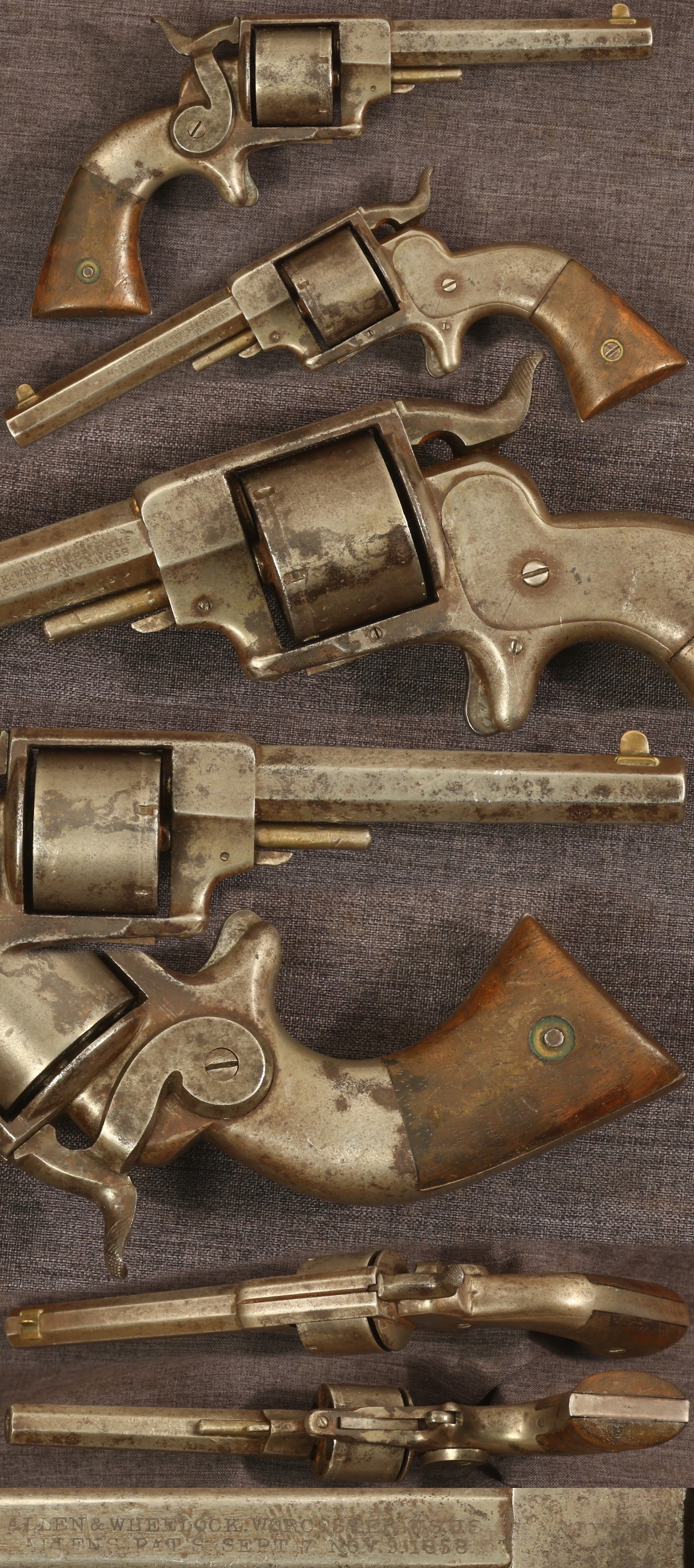 Allen & Wheelock .32 rimfire sidehammer revolver. Serial number 366. 4" octagon barrel with maker marking on left side. Gun shows expected wear and use overall with a medium gray patina and some scattered pitting. Walnut grips are evenly worn with some minor handling marks. Mechanically good, sold as a collector item only, not warranted safe to shoot.