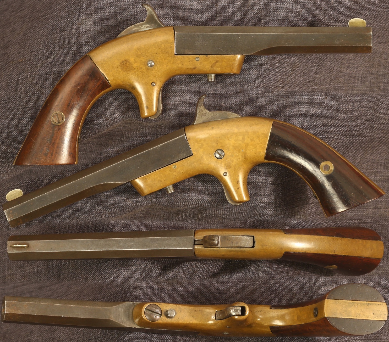 Single shot 32 rimfire caliber derringer, unmarked. Serial number 447. Flayderman 8A-076. 3-3/4" octagon barrel. Metal parts have a medium patina overall with a little light pitting on the barrel. Wood grips are good, showing light wear and use overall with a minuscule corner nick on the right side. Mechanically good, sold as a collector item only, not warranted safe to shoot.