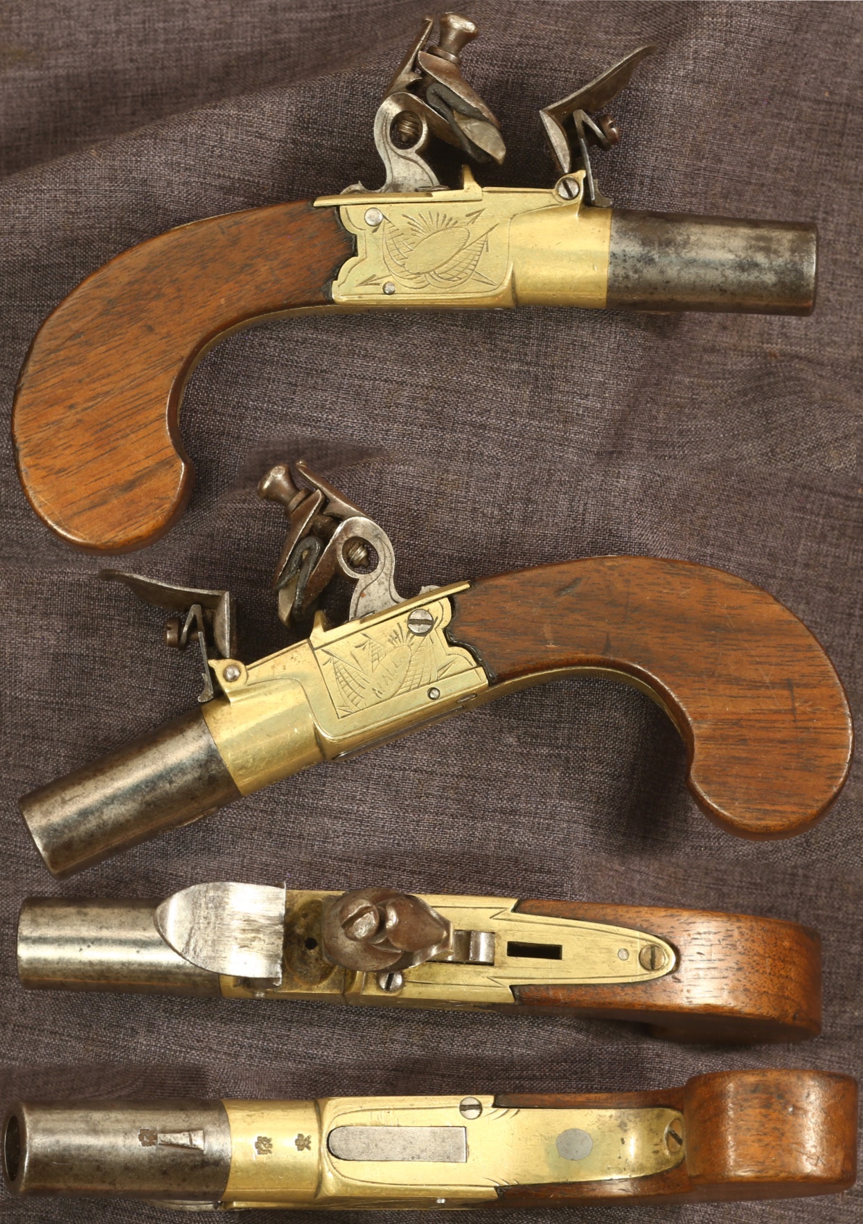 Brass frame English flintlock boxlock muff or pocket pistol. Barrel is 1-1/2" long with .47 caliber bore, about 6" long overall. Nicely engraved frame with added name "MALL" on left side. Brass is cleaned to a light coloration, barrel is a salt and pepper gray patina. Sliding safety is absent from top of frame. Wood grip is very good with some handling scratches present and some minuscule nicks to edge by frame. Mechanically good, sold as a collector item only, not warranted safe to shoot.
