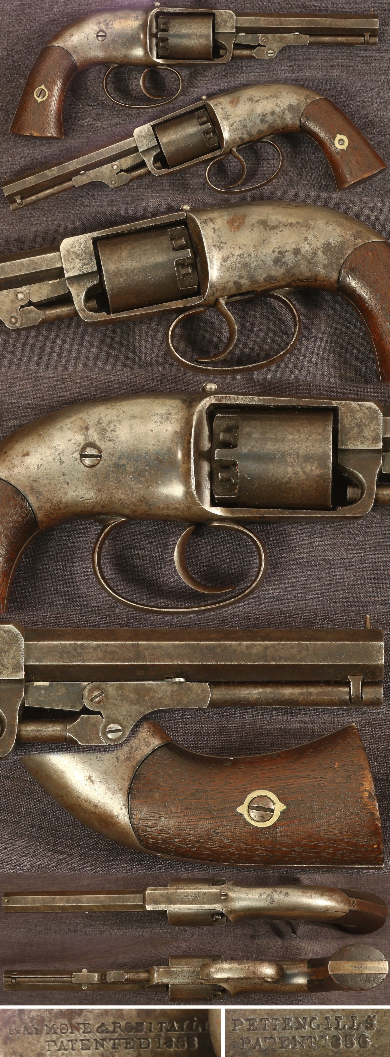 early style C.S.Pettengill double action hammerless percussion belt or navy model revolver. 4-1/2" barrel, .34 caliber. Only about 250 produced as described in Flayderman 7A-077. Serial number 352. Standard markings on top and bottom of frame. Metal parts are a medium gray patina overall with scattered pitting. Wood grips are very good, showing some wear and use with a couple minuscule corner nicks. Appears to be mechanically good. Sold as a collector item only, not warranted safe to shoot.