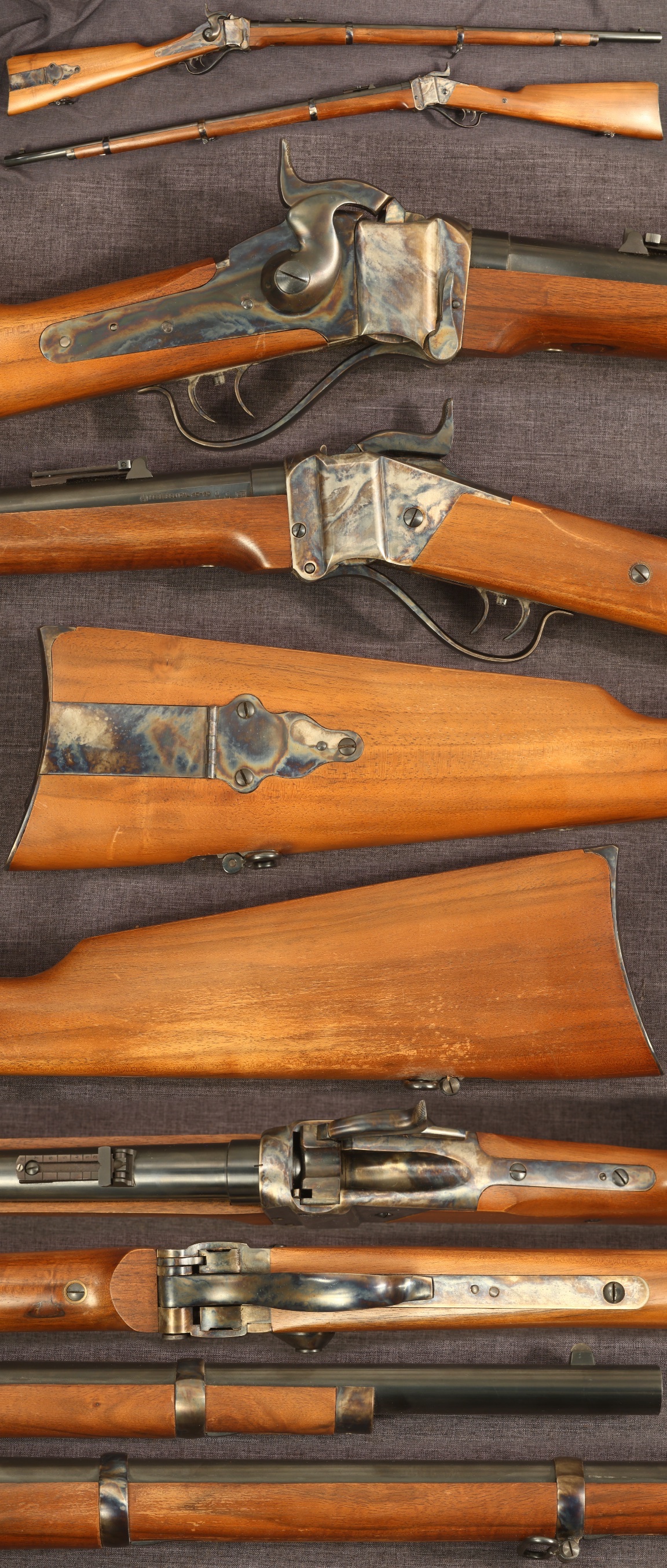 Pedersoli replica M1874 Sharps .45-70 3-band sniper rifle. Fine bore. Equipped with blade front sight, Lawrence pattern rear sight, and tang prepped for Creedmoor sight. Very Good + condition overall with excellent blued barrel and other metal parts color casehardened, sides of frame showing light silvering wear from use. Stocks show some light marks from handling, has a small filled spot in the bottom of the forearm probably in the making, and some wear to the finish to the butt primarily to the high edges and lower portion of the left side of the butt. Ships to FFL dealer. Mechanically functional with set triggers, not warranted safe to shoot, buyer should consult a professionally trained gunsmith if considering shooting this rifle.