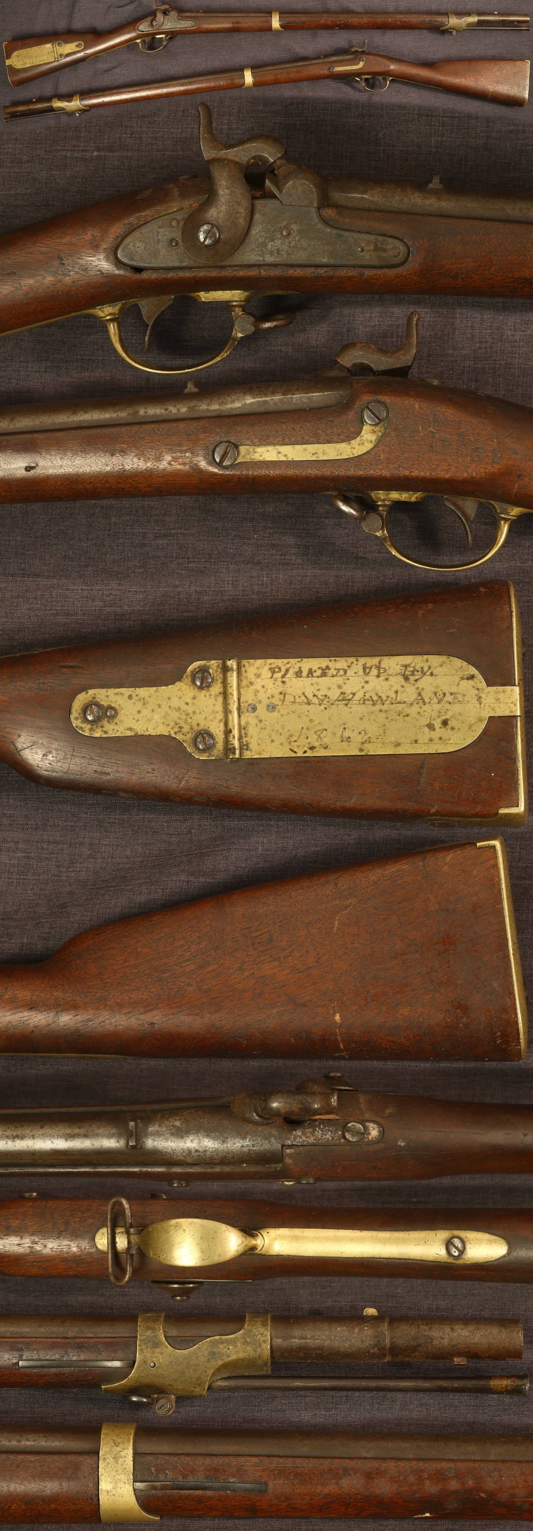 M1841 US "Mississippi" rifle by Remington, 1848. Variation with "turned down" muzzle to accept socket bayonet, preserving the original front sight and applying a bayonet stud to the underside of the barrel. Flayderman 9A-282. Barrel proofs are visible, along with a partial inspector cartouche opposite the lock. Clearly engraved on the patchbox cover "PICKED UP BY/D.W.HOWLAND/1862." Daniel W. Howland of Binghamton, NY is the only possible match. He served in the 137th New York Volunteers for a little over 4 months before deserting. No return or further service is noted. Brass parts are a light coloration, iron parts have a medium-dark patina overall with some pitting in the breech area, associated with some erosion to the metal and wood in the vicinity. Stock shows average wear and use with numerous minor handling marks, a worn sliver from the ramrod channel, and a small chip in the lower lock mortise. Mechanically good, sold as a collector item only, not warranted safe to shoot.
